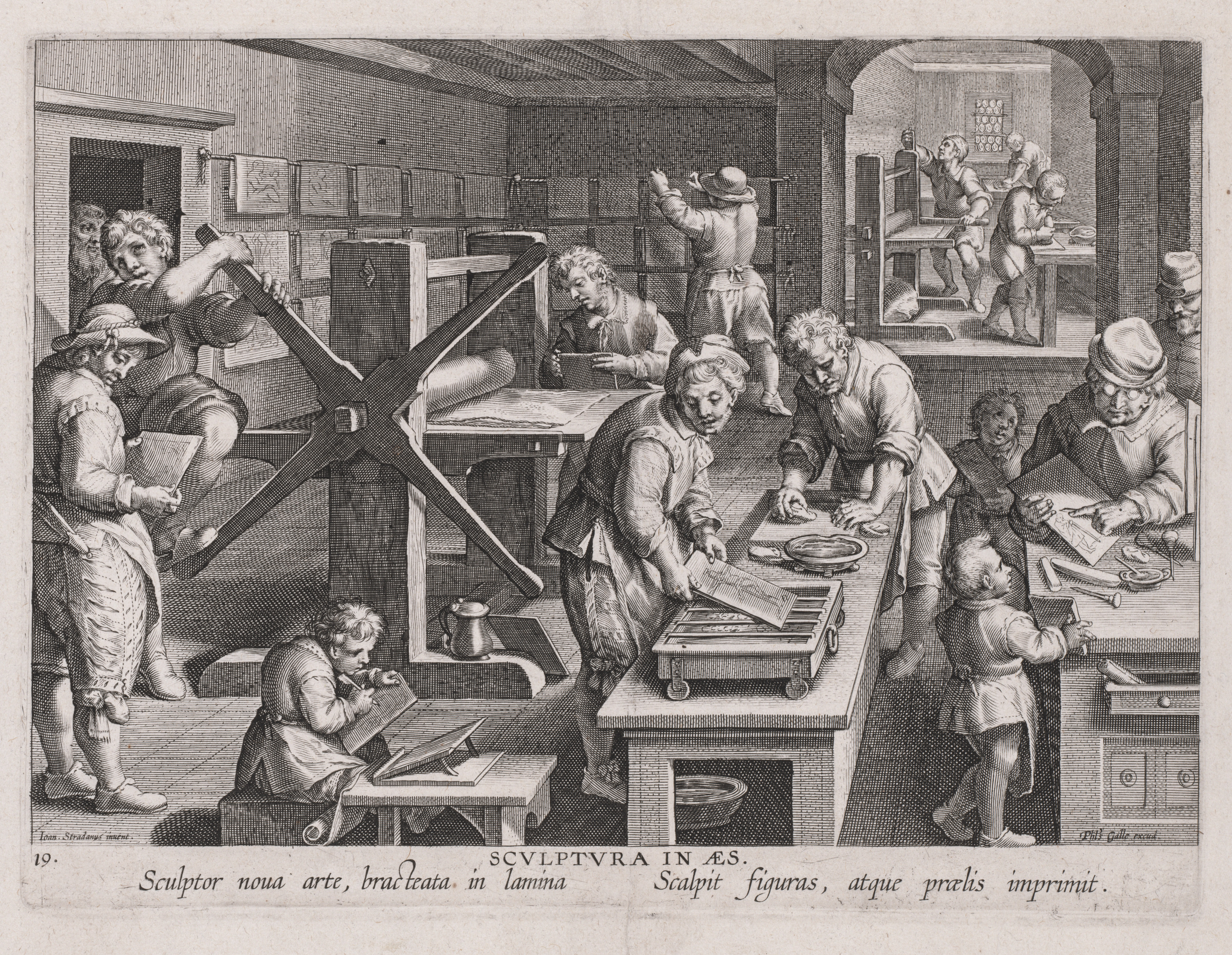 Black and white image of a room filled with people working. Multiple tables and a large piece of equipment are present. Some people are standing, others are sitting. The room appears to be indoors with a high ceiling. The people are dressed in 16th or 17th-century clothing, including hats, aprons, and loose-fitting shirts and pants. Some are holding tools, such as hammers, and working on objects on the tables. There are papers and other objects on the tables. In the background, there is an archway leading to another room where more people are working. The walls have framed pictures or objects hanging on them. The image has a border around it, and there is text at the bottom.