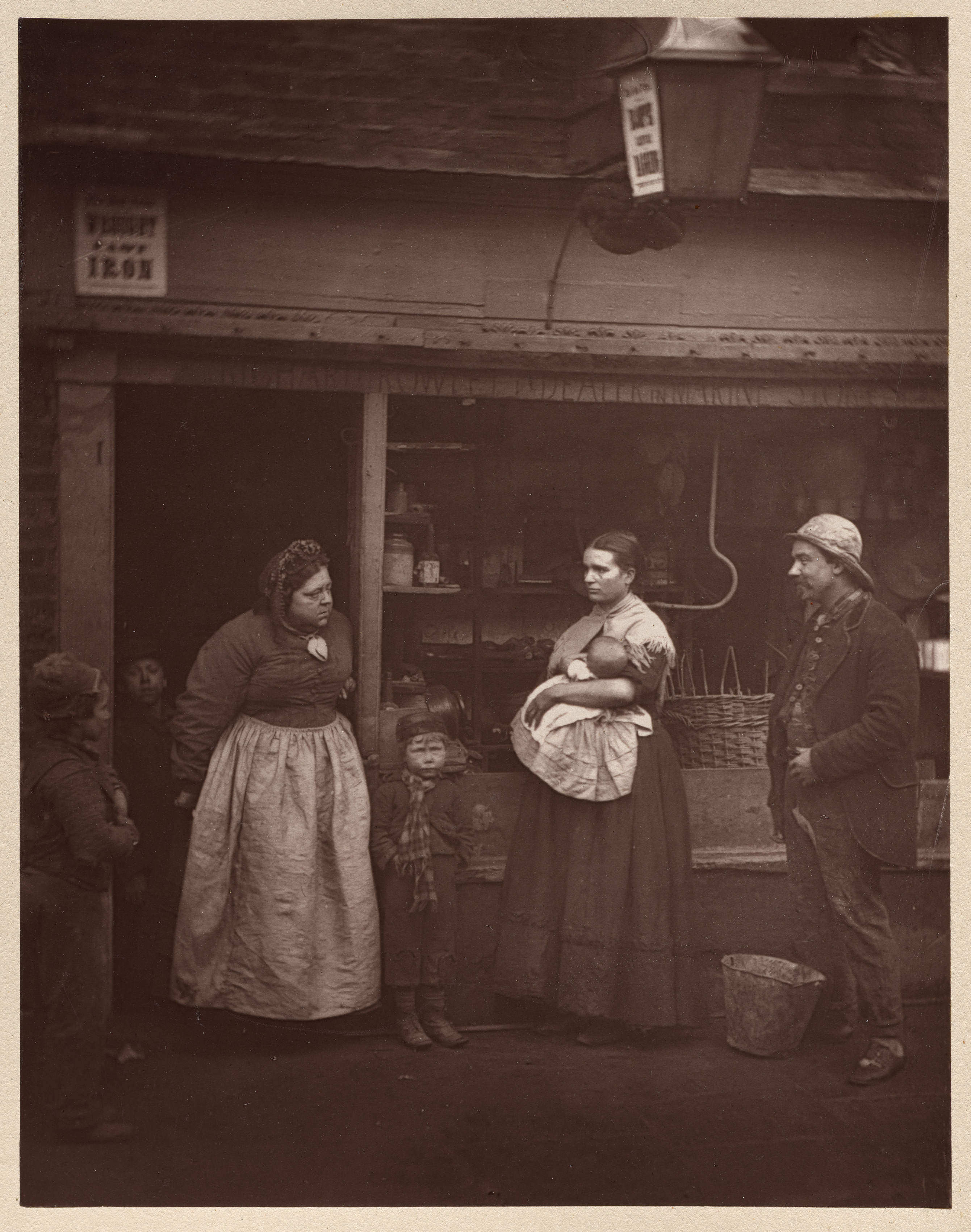 The image shows a group of people standing outside a shop. Two women and a child stand in the center, with a man to the right. The woman on the left wears a long dress and headscarf, the woman on the right wears a long dress and holds a baby, and the child wears a dress and scarf. The man on the right wears a hat, jacket, and pants. A child stands to the left. A sign is above the doorway and shelves and a basket are visible behind the people. A bucket sits on the ground. The image is in sepia tone. The title is "Sufferers from the Floods" and the artist is John Thomson.