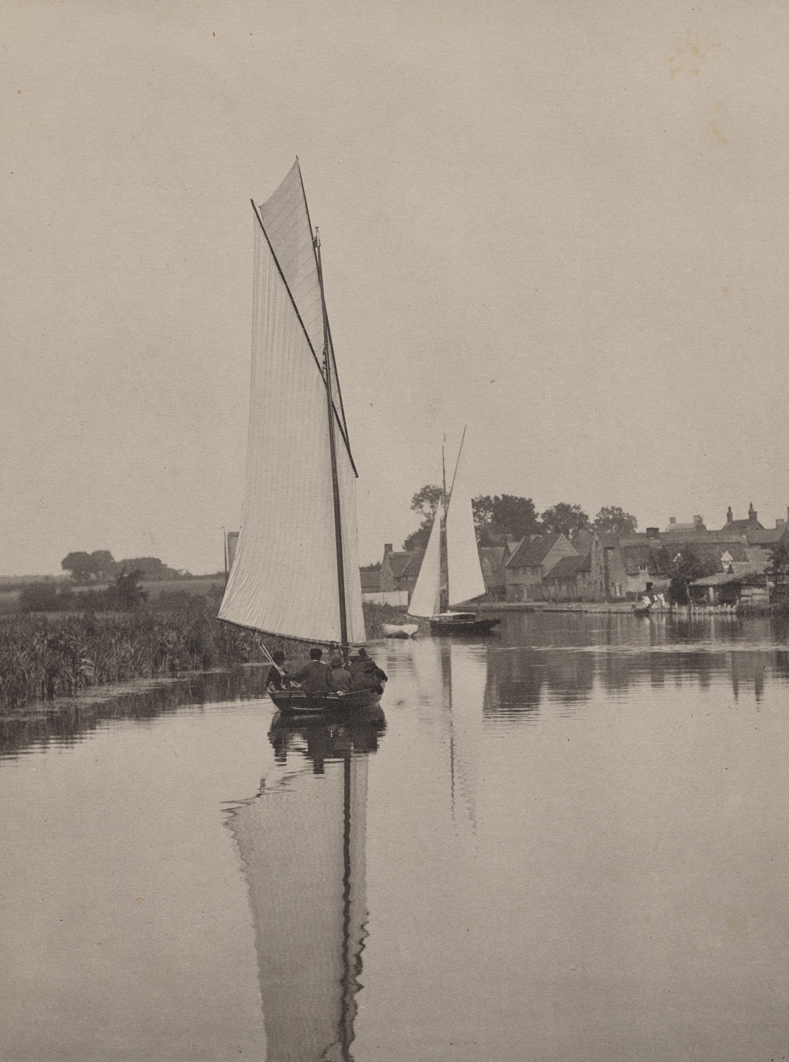 Black and white photograph of a body of water. Two sailboats are on the water. The sailboat closest to the camera has a triangular sail and a small hull with three people in it. The sailboat in the distance has a triangular sail and a small hull. There are buildings on the right side of the image and vegetation on the left side. The sky is overcast. The title of the photograph is The Village of Horning and the artist is Peter Henry Emerson.