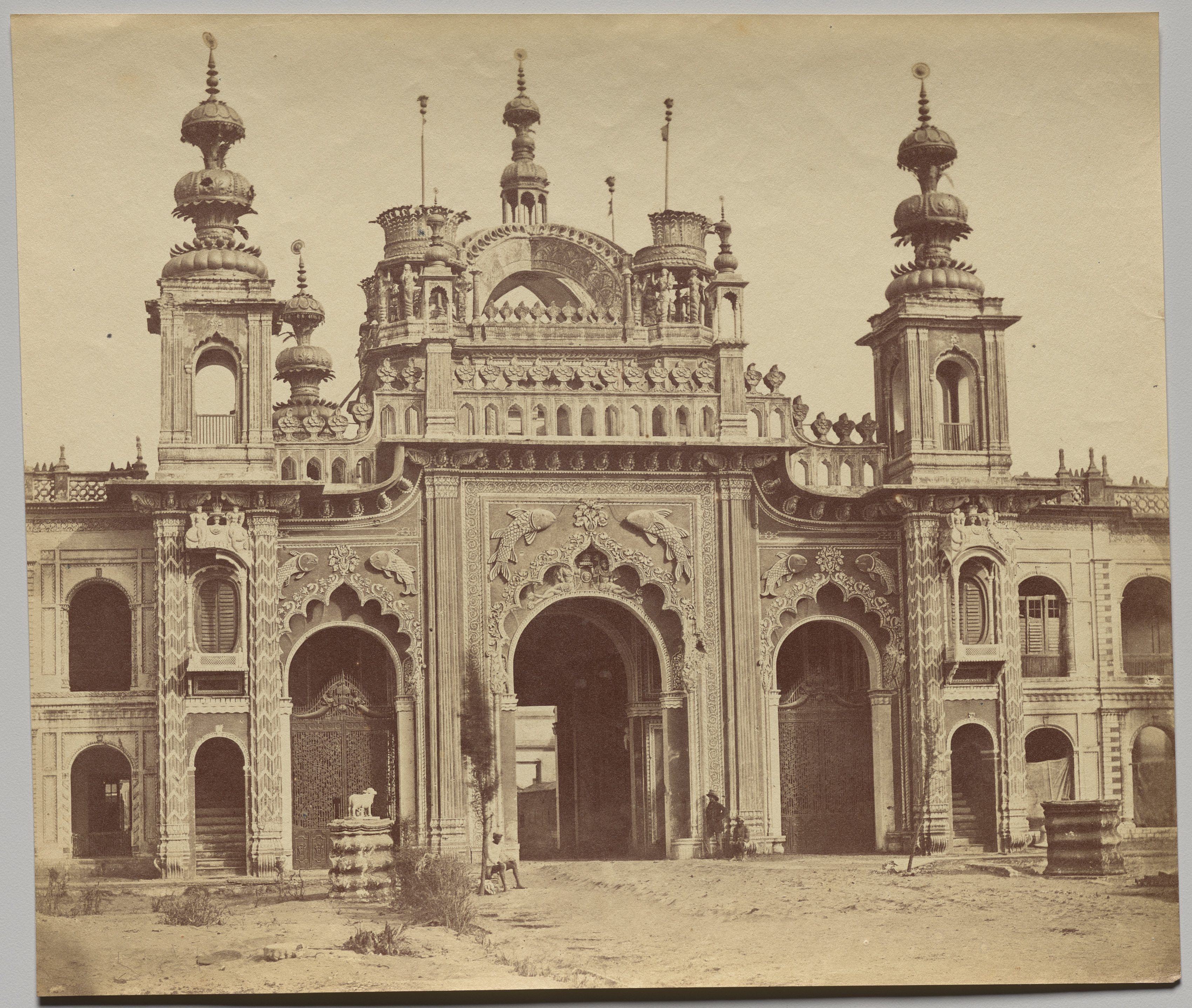 The Great Gateway of the Kasierbagh by Felice A. Beato. Sepia-toned photograph of a large, ornate building with multiple archways and towers. The building has a central section with a large archway flanked by two smaller archways on either side. Above the central archway is a balcony with a decorative railing. The building is adorned with intricate carvings and ornate details. Two towers with domed tops flank the central section of the building. The towers have smaller archways and are topped with spires. The building appears to be made of stone or brick. There are people standing in front of the building. The ground in front of the building is dirt. The sky above the building is clear.
