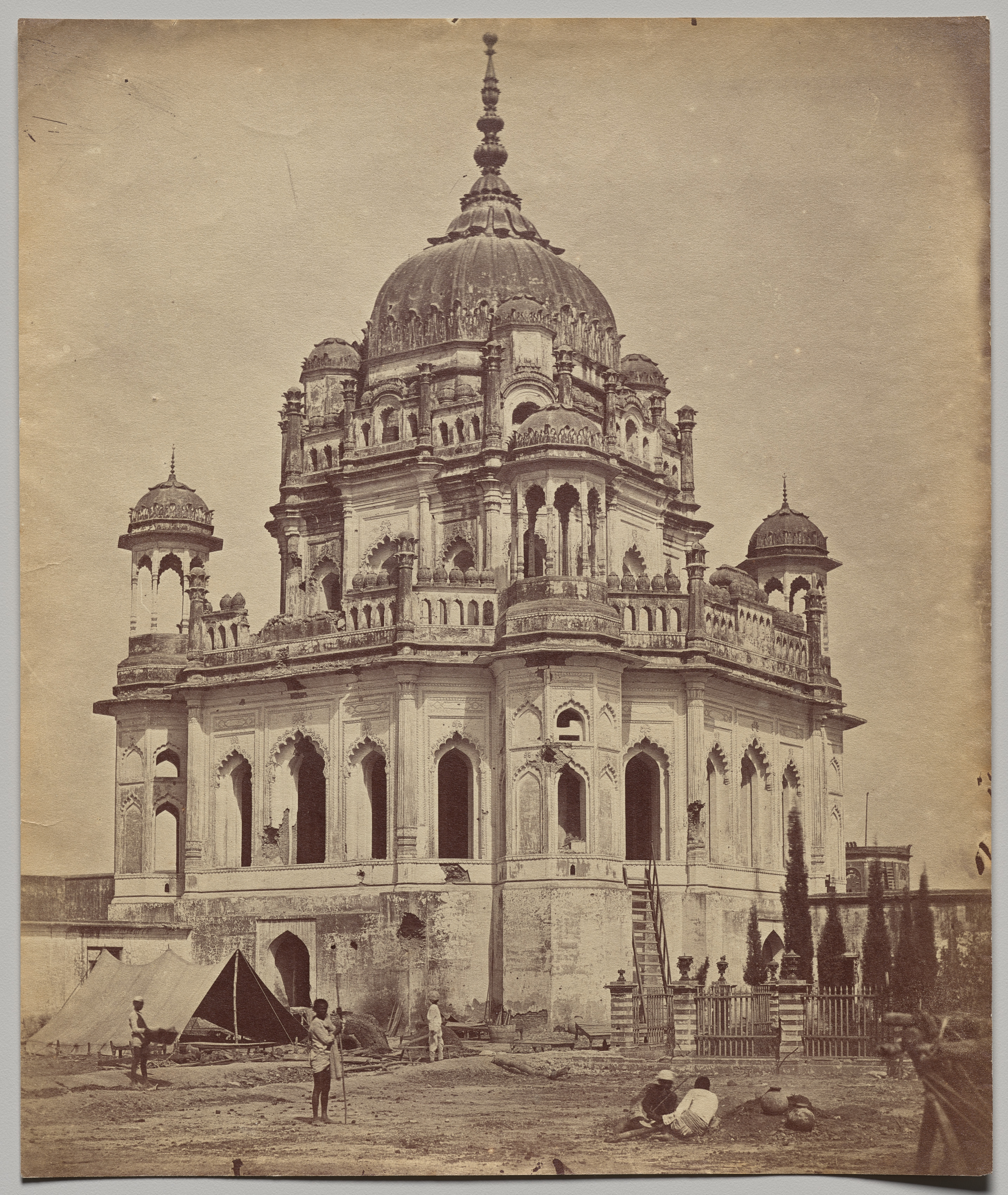 The Tomb of Saadat Ali in the Kaiserbagh Palace. A large, ornate building with a central dome and several smaller domes. The building has multiple levels, with intricate carvings and arches throughout. A fence surrounds the building, and several people are sitting or standing in front of it. A tent is set up to the left of the building. The image is sepia-toned.