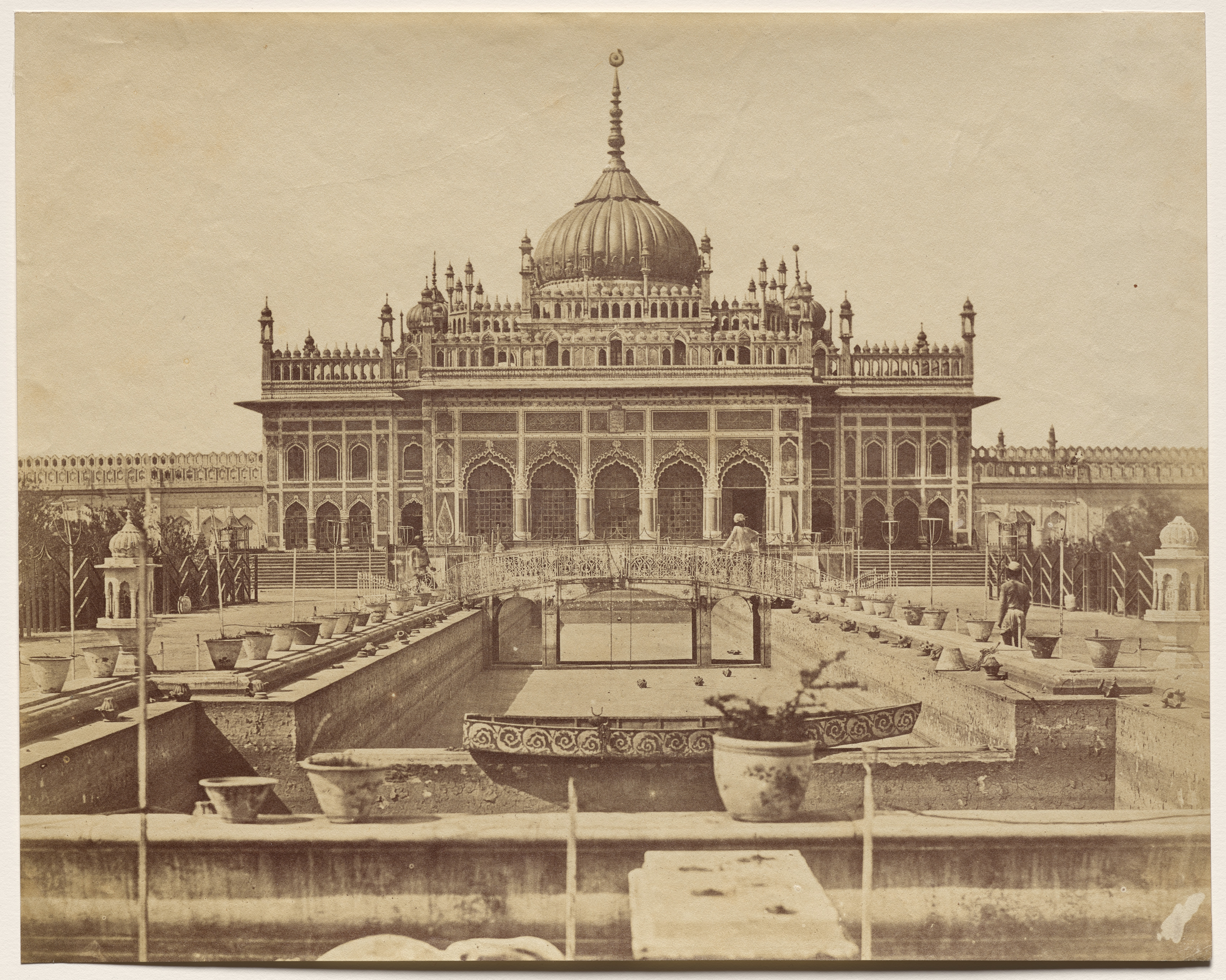 Sepia-toned photograph of a large, ornate building with a central dome and multiple smaller domes and spires. The building has a symmetrical facade with a row of arches on the ground floor and a row of windows on the upper floor. A large pool or fountain in the foreground, surrounded by potted plants and a low wall. A person in white clothing standing on a platform to the left of the building. A person in dark clothing standing on the right side of the pool. A long wall with a decorative top runs along the left and right sides of the image. The building and wall are constructed from stone or brick with intricate carvings and ornate details.