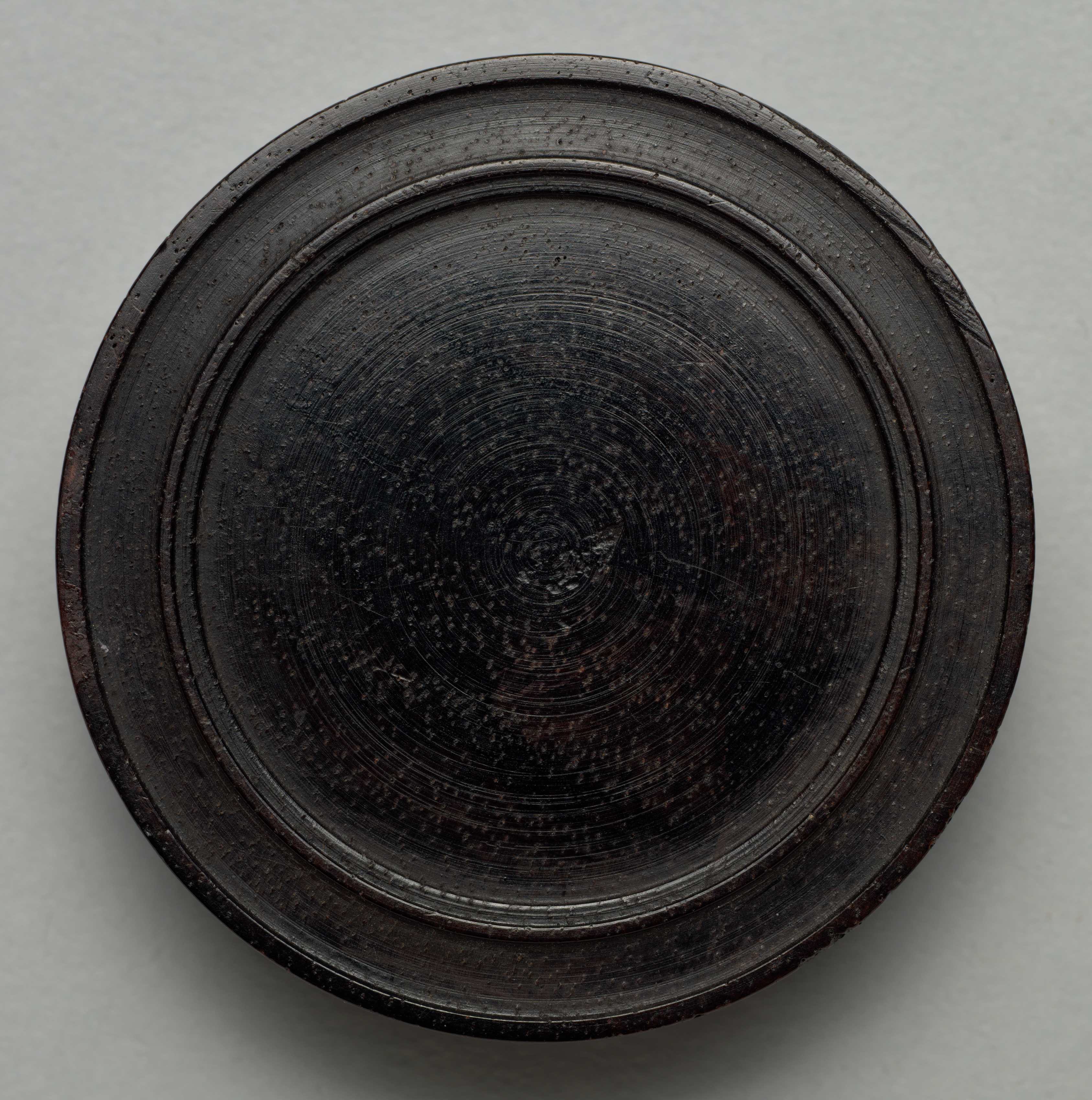 Dark brown circular object, Gaming Piece, by Martin Brunner. Object has a wide rim and two concentric circular grooves. The surface is scratched and marked with concentric circles. The object appears to be made of wood. The background is light gray.