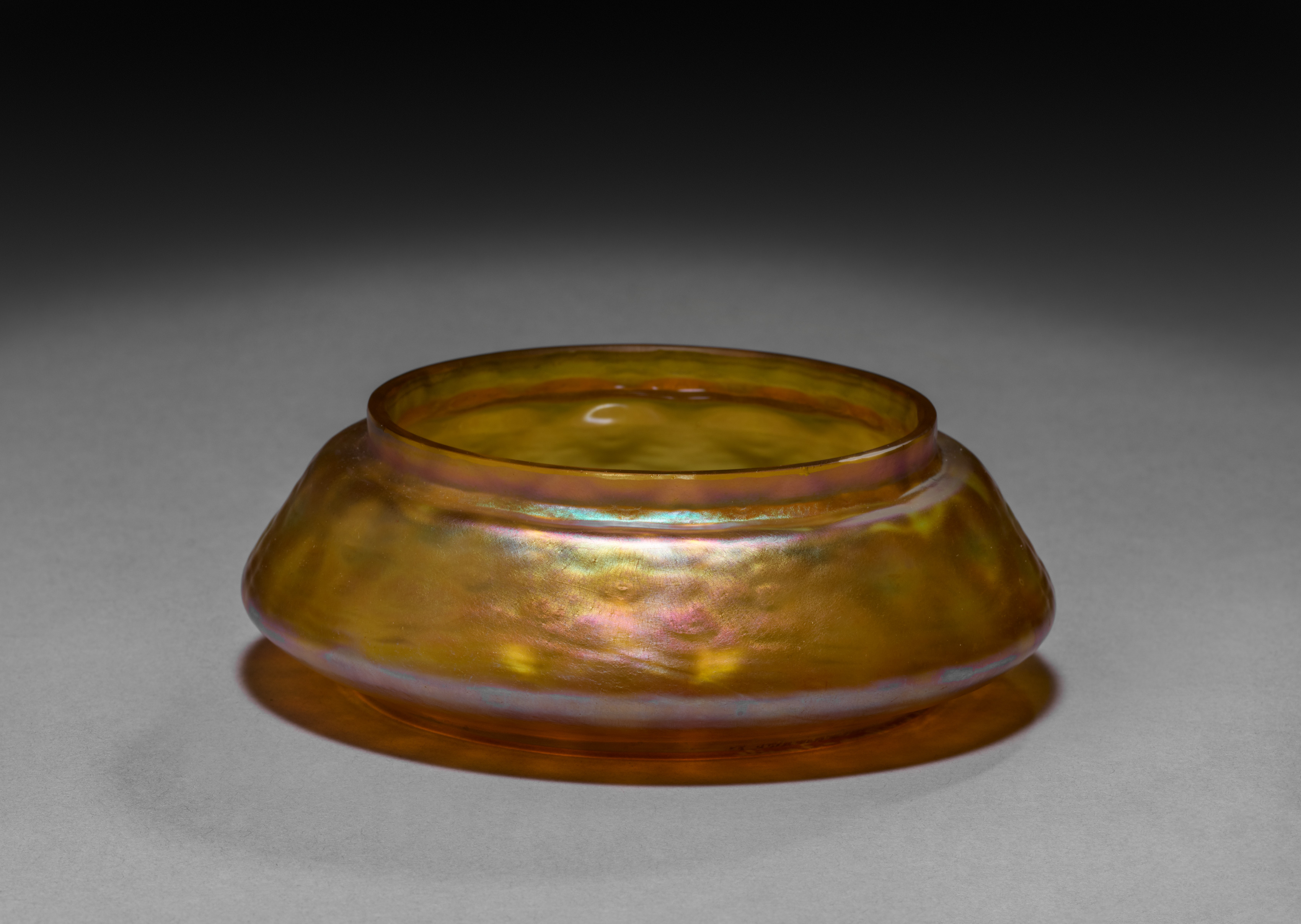 The object is a rounded, glass container with an iridescent sheen. The container has a wide mouth and a narrow base. It is primarily amber-colored with hues of gold, pink, and green visible due to the iridescence. The container appears to be made of glass and has a smooth, shiny surface. The background is a gradient from dark at the top to light gray at the bottom, with the container casting a shadow on the surface below it. The creator of the object is the Tiffany Glass & Decorating Company, and the object is referred to as a box.