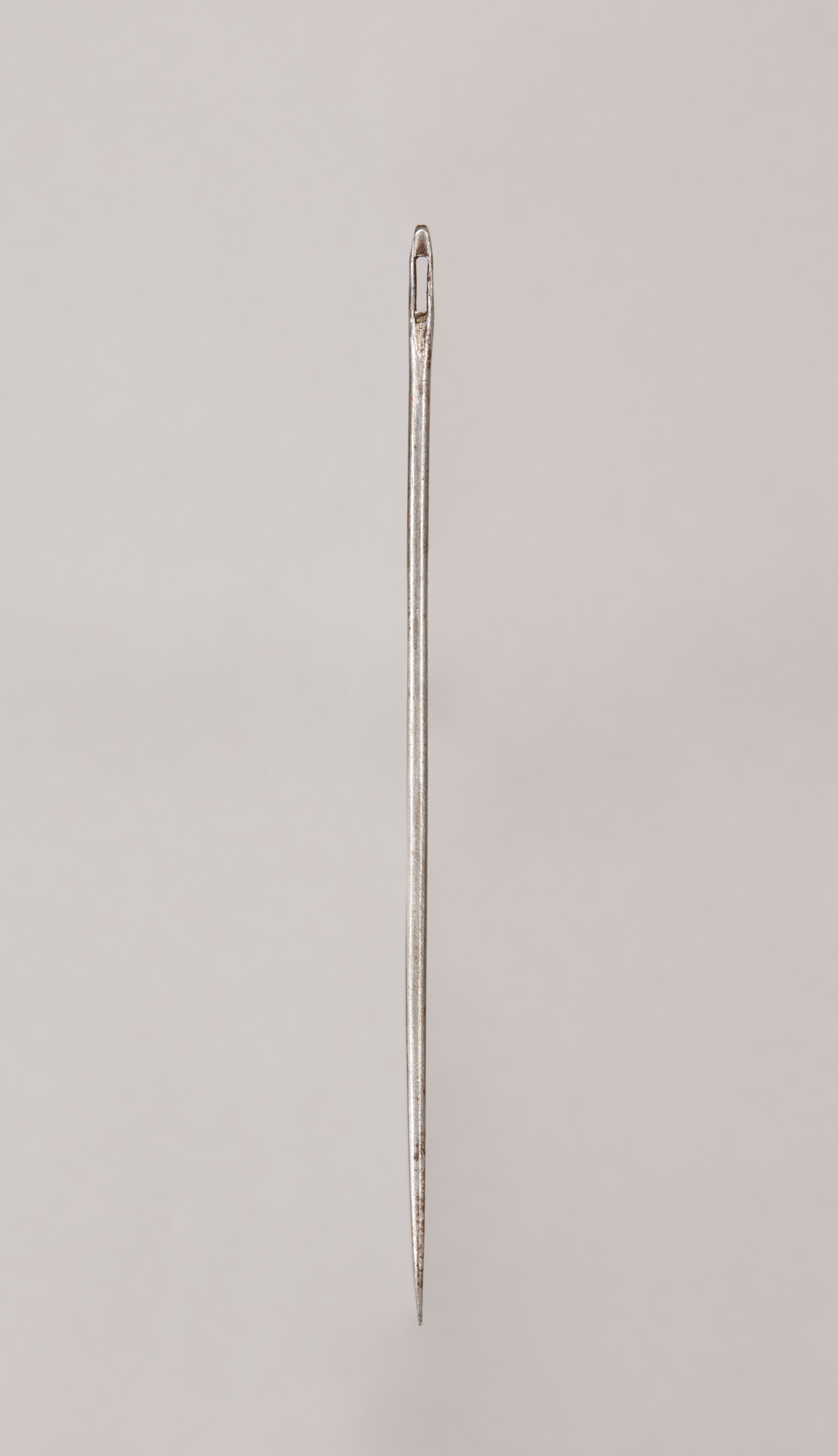 The image depicts a sewing needle titled "Scabbard Needle" by an artist. The needle is long and thin, made of metal, with a tapered point at the bottom and an eye at the top. The eye of the needle is an oval-shaped hole. The background is a solid light gray color. The needle is centered in the image, standing vertically. The lighting is even, with no shadows or highlights. The image is a close-up, with the needle filling most of the frame.