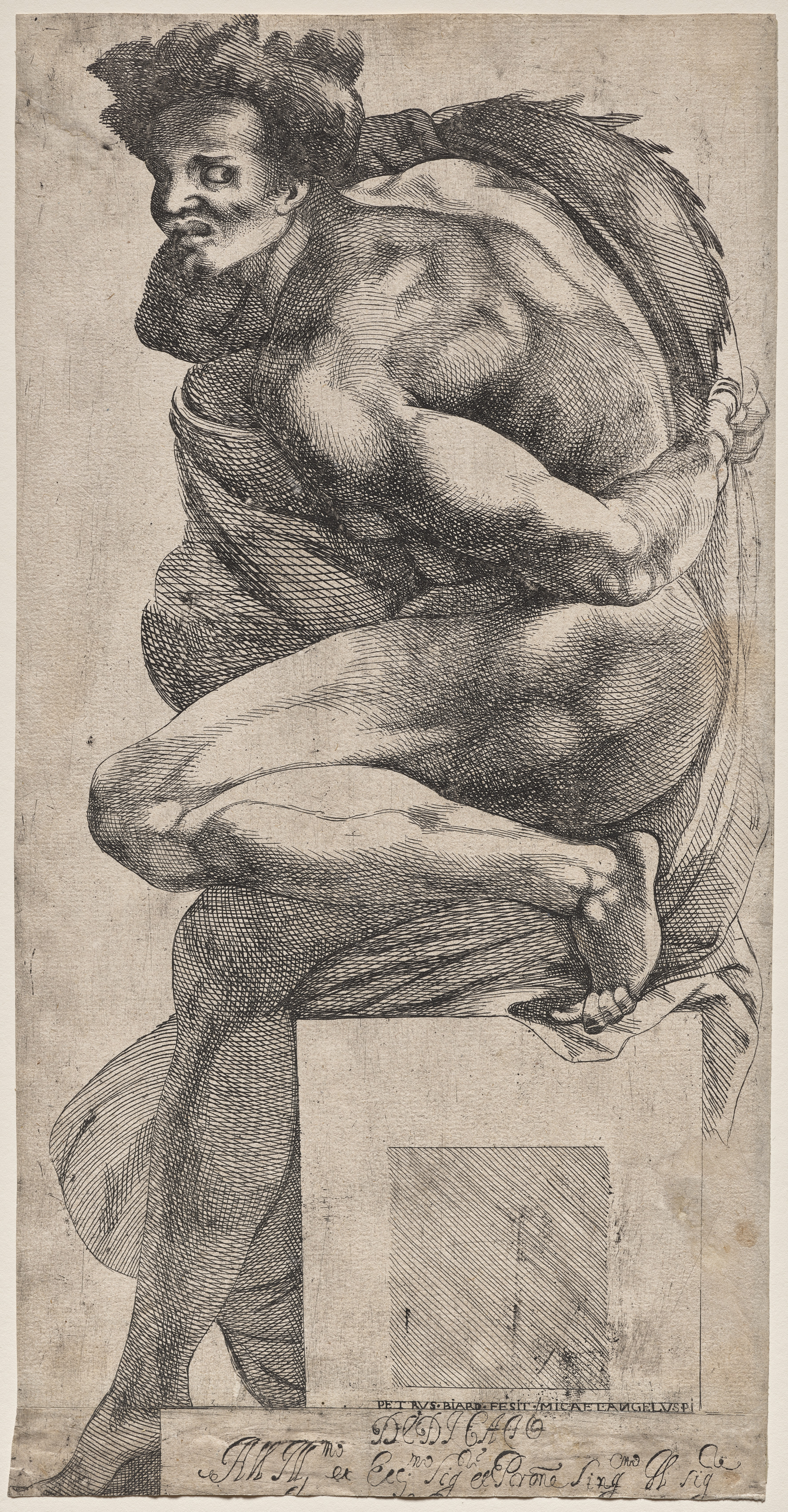 Black and white drawing of a male nude with curly hair and a beard. The man is sitting on a block with his right leg bent in front of him and his left leg bent behind him. His right arm is bent at the elbow and his hand is touching his right knee. His left arm is behind his back. He has a cloth wrapped around his waist and over his left shoulder. The drawing is on a beige background with darker shading around the figure. There is a small rectangle with diagonal lines at the bottom of the block. There is cursive writing at the bottom of the image. The drawing style is highly detailed and realistic. It depicts a famous sculpture, "Ignudo", created by Michelangelo, reinterpreted by Pierre Biard the Younger.