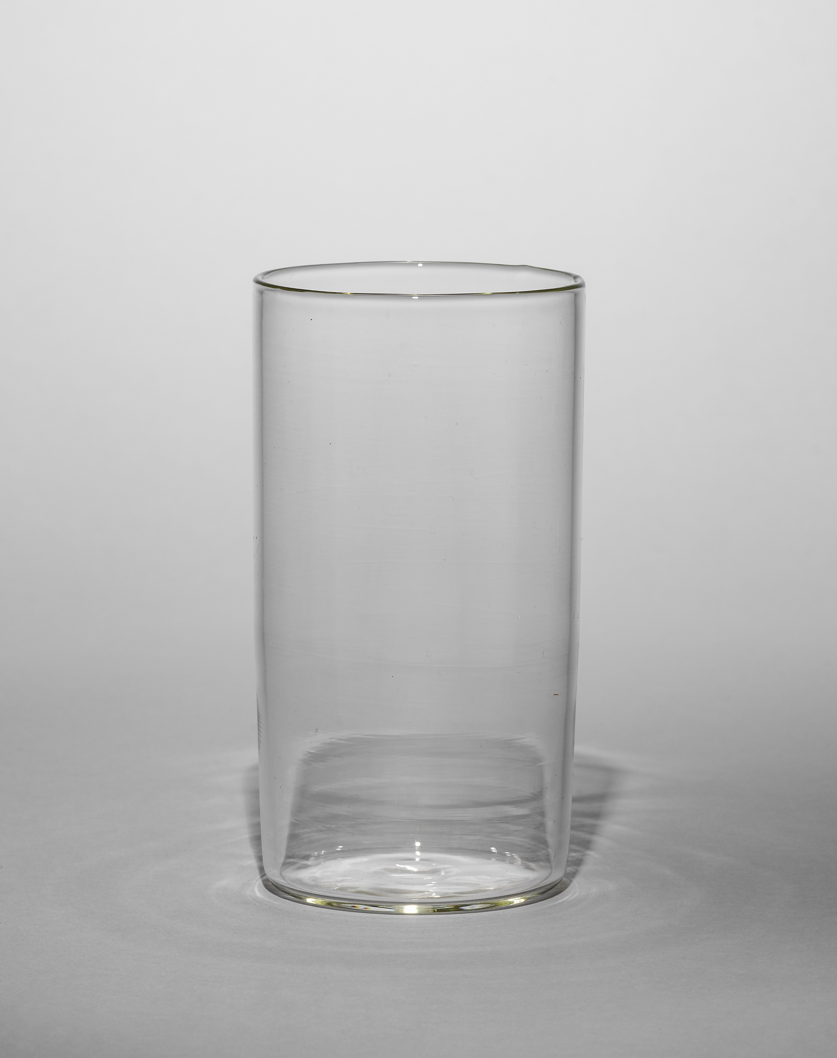 The Tea Cup by House of Fabergé is a clear glass cup. The cup is tall and cylindrical with a flat bottom and straight sides. The rim of the cup is thin. The cup appears to be empty and made of transparent material, likely glass. It is sitting on a plain surface with a light-colored background. There is a slight shadow cast by the cup on the surface it's sitting on.