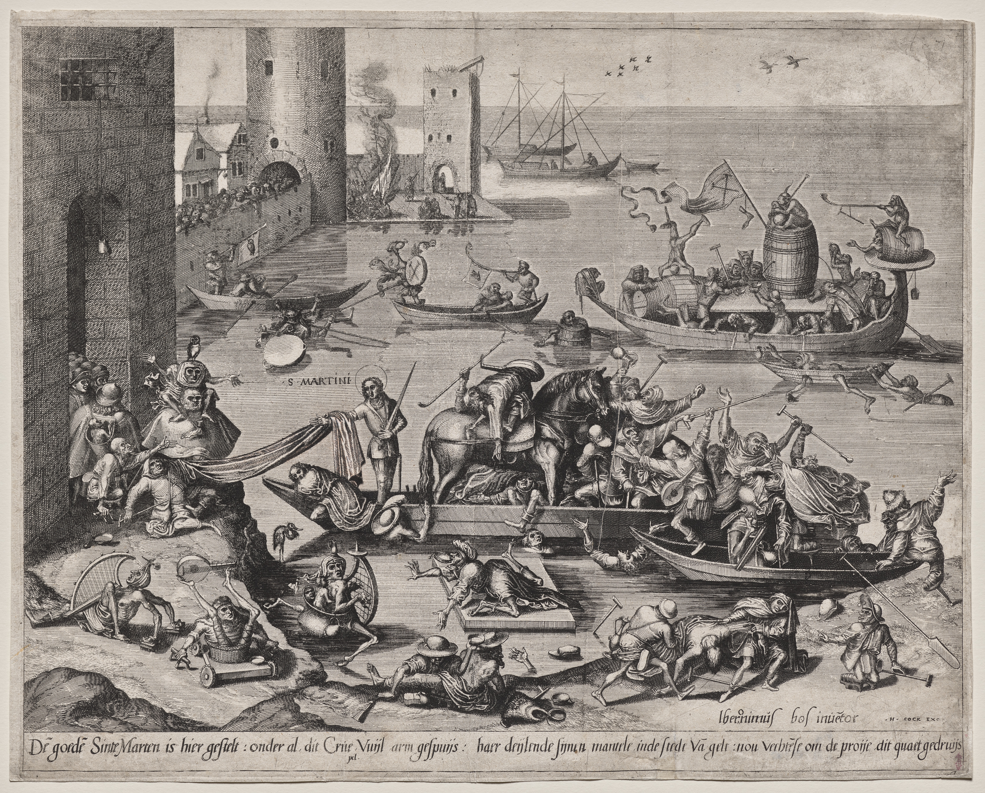 Black and white etching of a chaotic scene. A man on horseback wearing a long robe and a halo stands in a boat. The boat and horse are surrounded by other boats. People are fighting with clubs and swords while falling into the water or jumping from boats. The boats are on a body of water near a city with a tall brick wall and gate tower. The water meets a shore on the left with people sitting and standing. In the background, there are more boats on the water and buildings on the shore. The sky has birds flying in it. There is text at the bottom. The style is detailed and busy with many figures and objects.