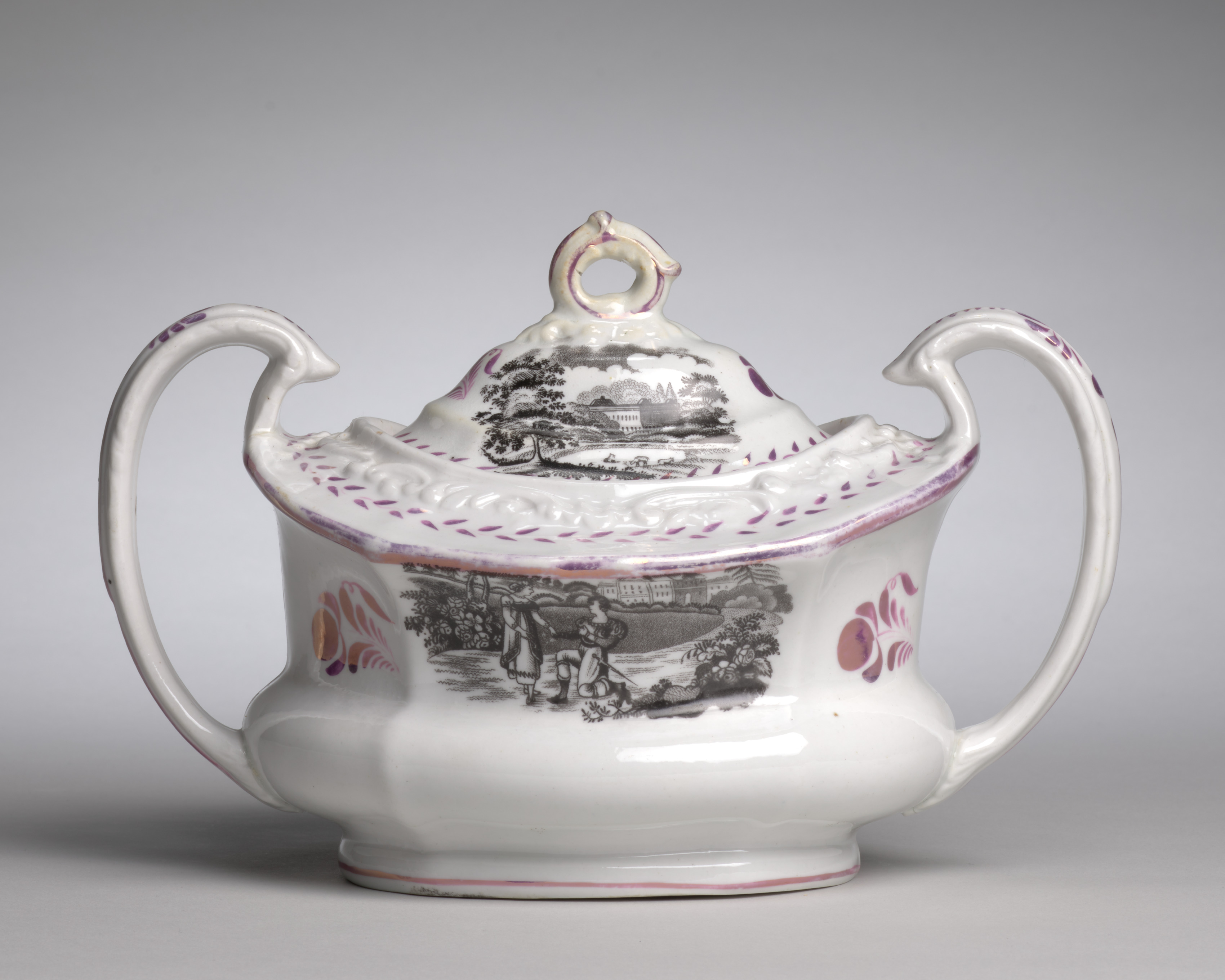 White ceramic sugar bowl and lid with two handles, one on each side, and a knob on top of the lid. The body of the bowl is decorated with a black and white scenic transfer on the front and a similar design on the lid. The edges of the lid and bowl have purple detailing. There are also purple and orange floral designs on the body of the bowl. The background of the image is gray. Sugar Bowl and Lid.