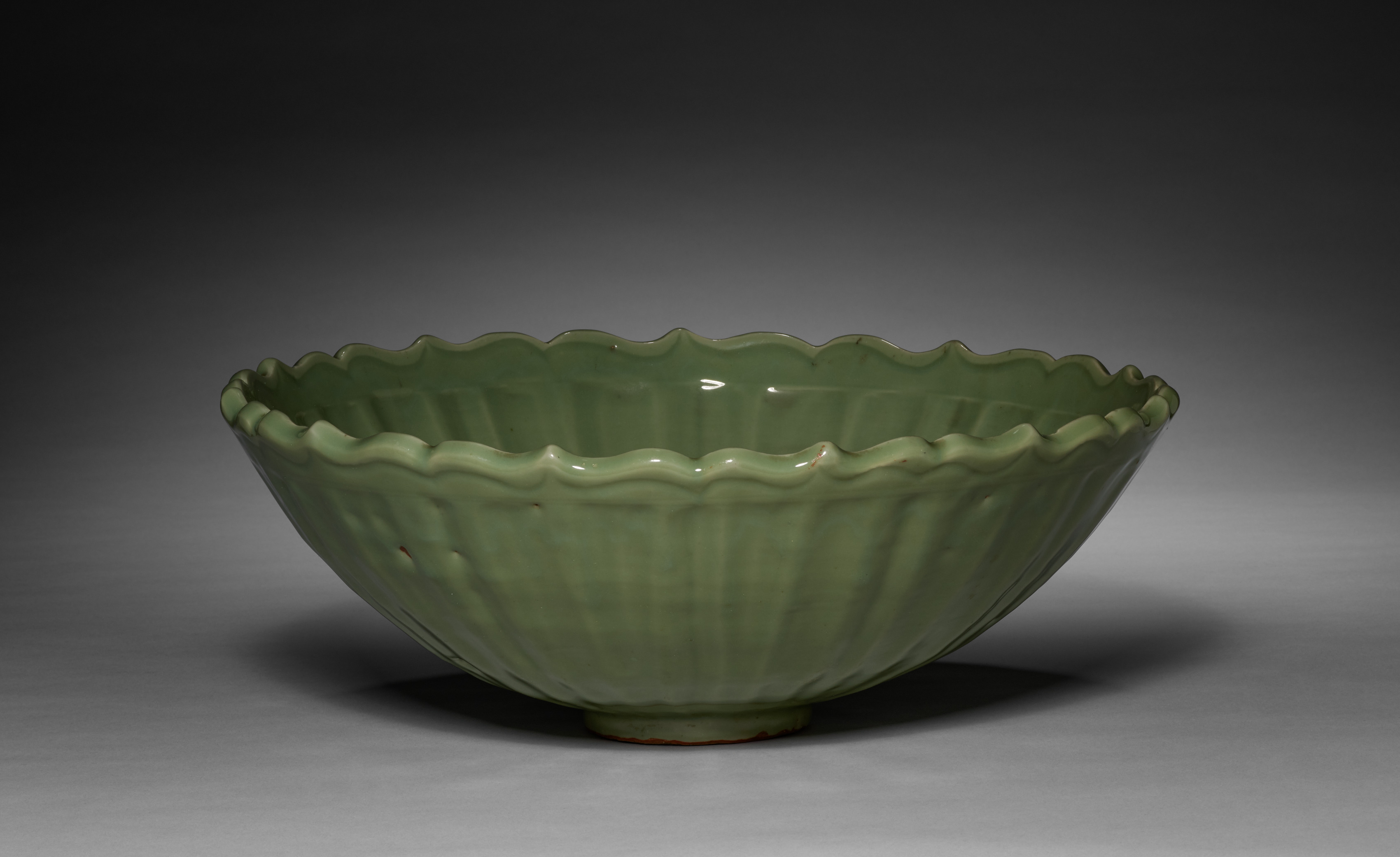 The image depicts a green ceramic bowl. The bowl has a wide mouth and a narrow base. The exterior and interior of the bowl has vertical ridges. The rim of the bowl is wavy. The bowl is glazed in a muted green color. The background is dark gray and light grey gradient with the bowl casting a shadow on the surface below it.