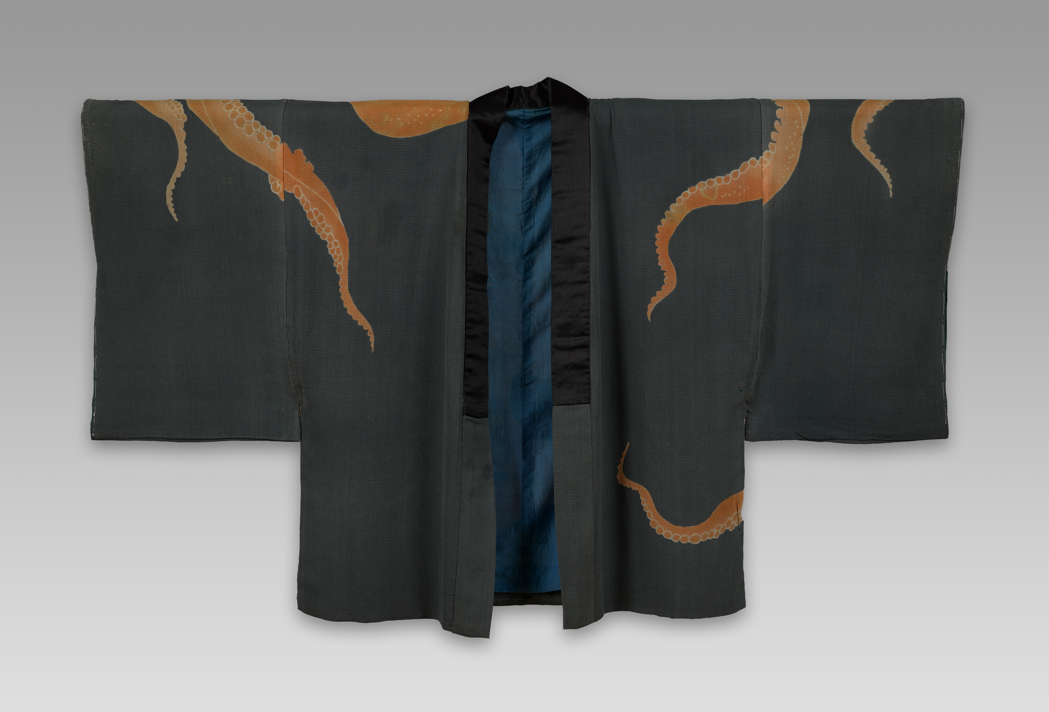 Dark gray jacket with wide sleeves and a black tie at the top. The jacket has 6 orange octopus tentacles on it. The inside of the jacket is blue.