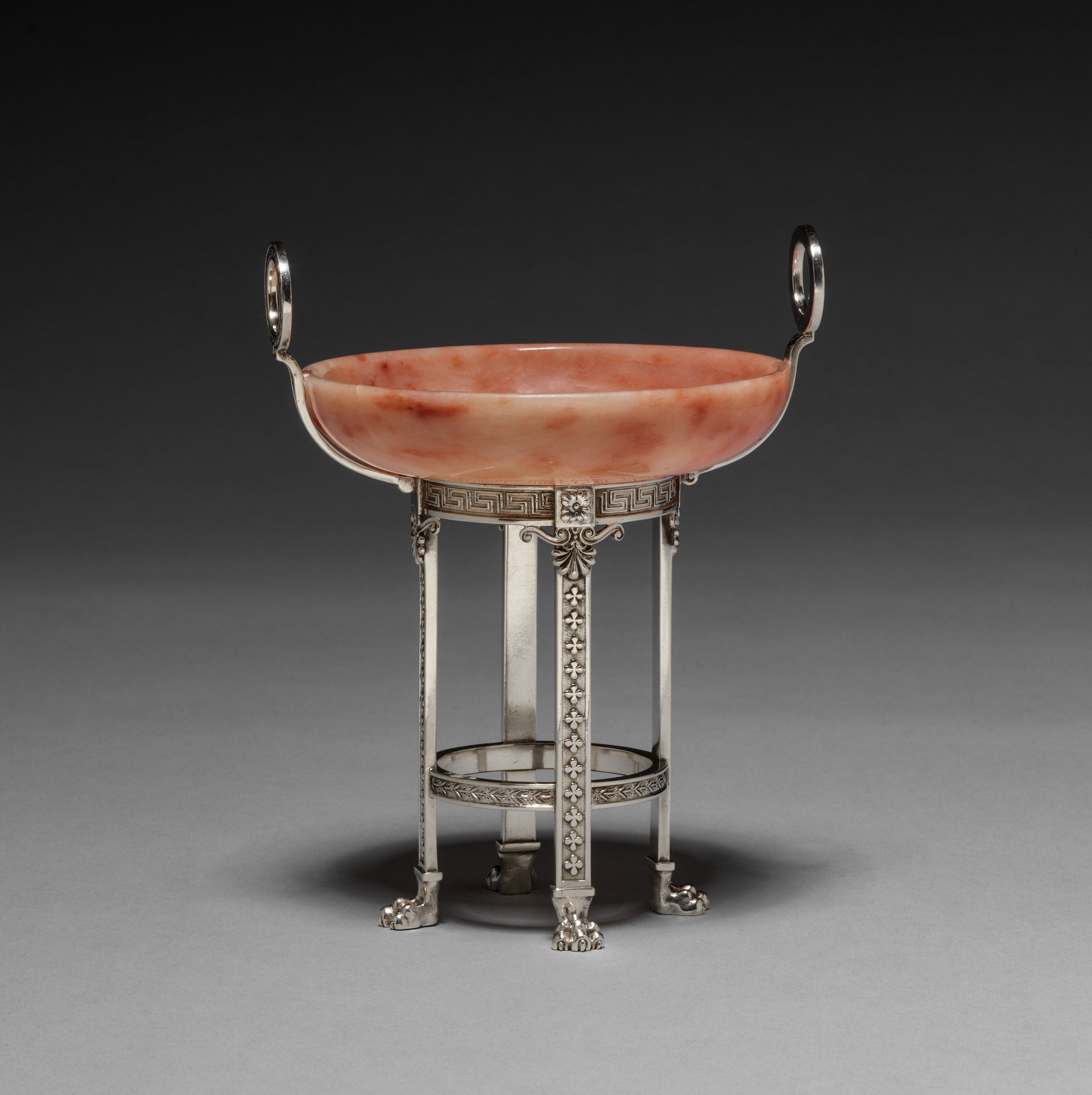 Miniature compote by House of Fabergé. The object is a small bowl on a stand. The bowl is made of pink stone with red spots and has a smooth surface. Two silver handles are attached to the bowl, one on each side. The bowl rests on a silver stand with four legs and a circular base. The stand has a decorative design around the top and on the legs. The background is a gradient from dark to light gray.