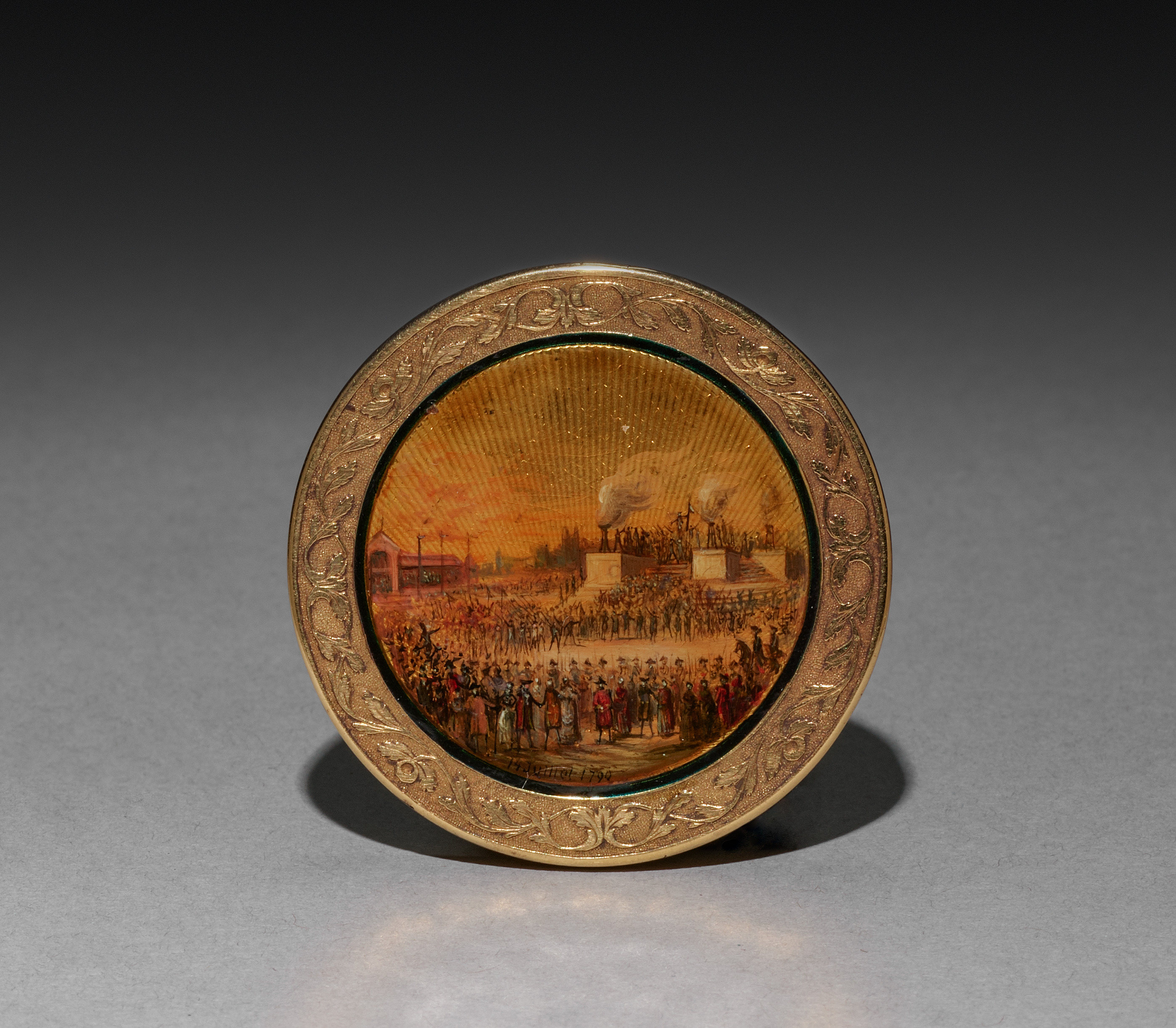 Gold-colored circular object with a scene of a crowd gathered around a platform. The object has a raised decorative border around its edge. The scene on the object depicts a large group of people standing in front of a platform or stage, with buildings visible in the background. The sky above is orange. The object casts a shadow on a gray surface.