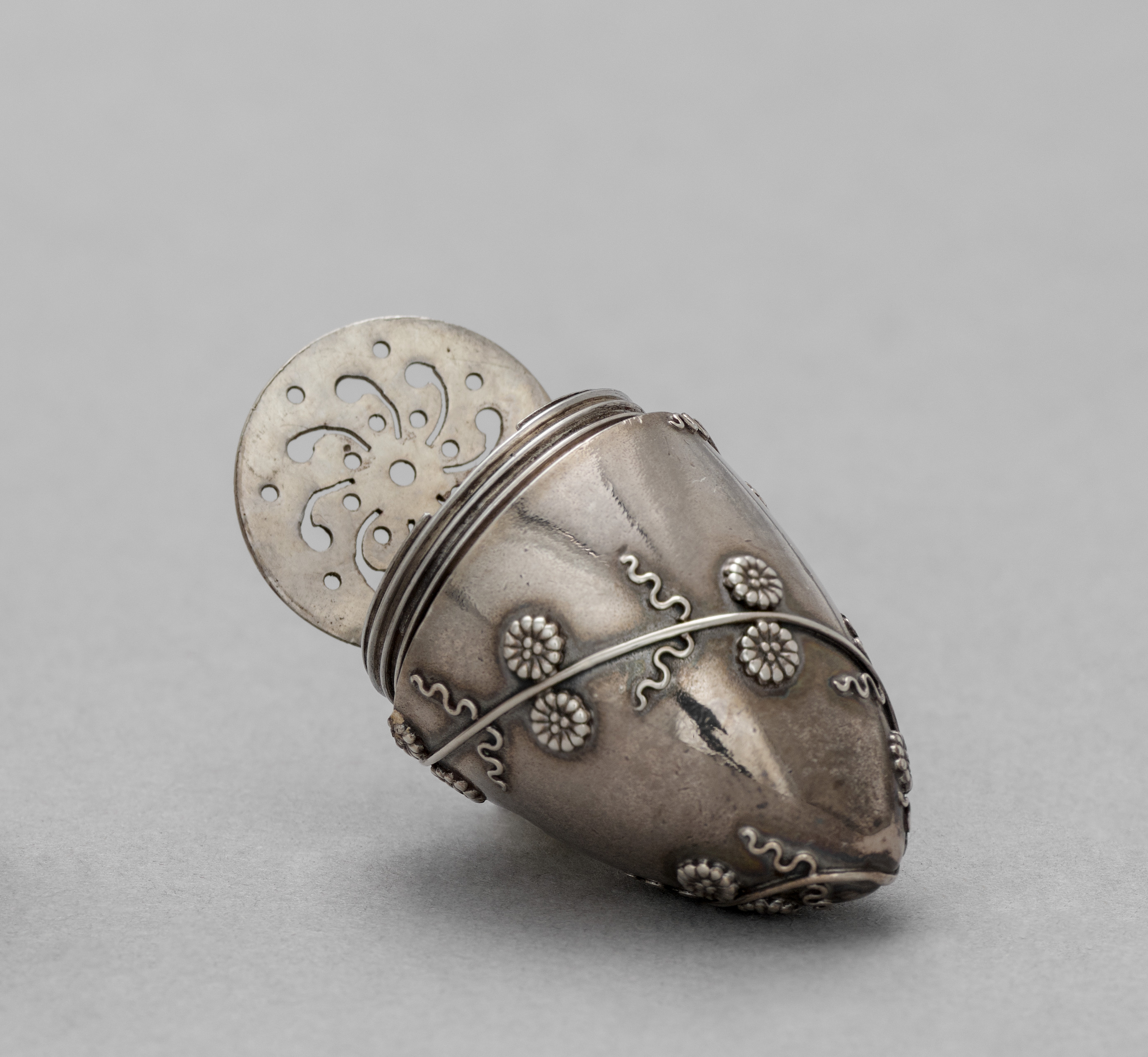 Silver container with a rounded rectangular body, and a circular lid. The body features a floral pattern with small flowers and wavy lines. The lid has a filigree design with holes and curved lines. The container is made of silver metal, with a darker patina on the body. The lid is positioned at an angle, appearing to be partially open. The container is displayed on a light gray background. The container is by Tiffany & Co. and is a smelling salts container.