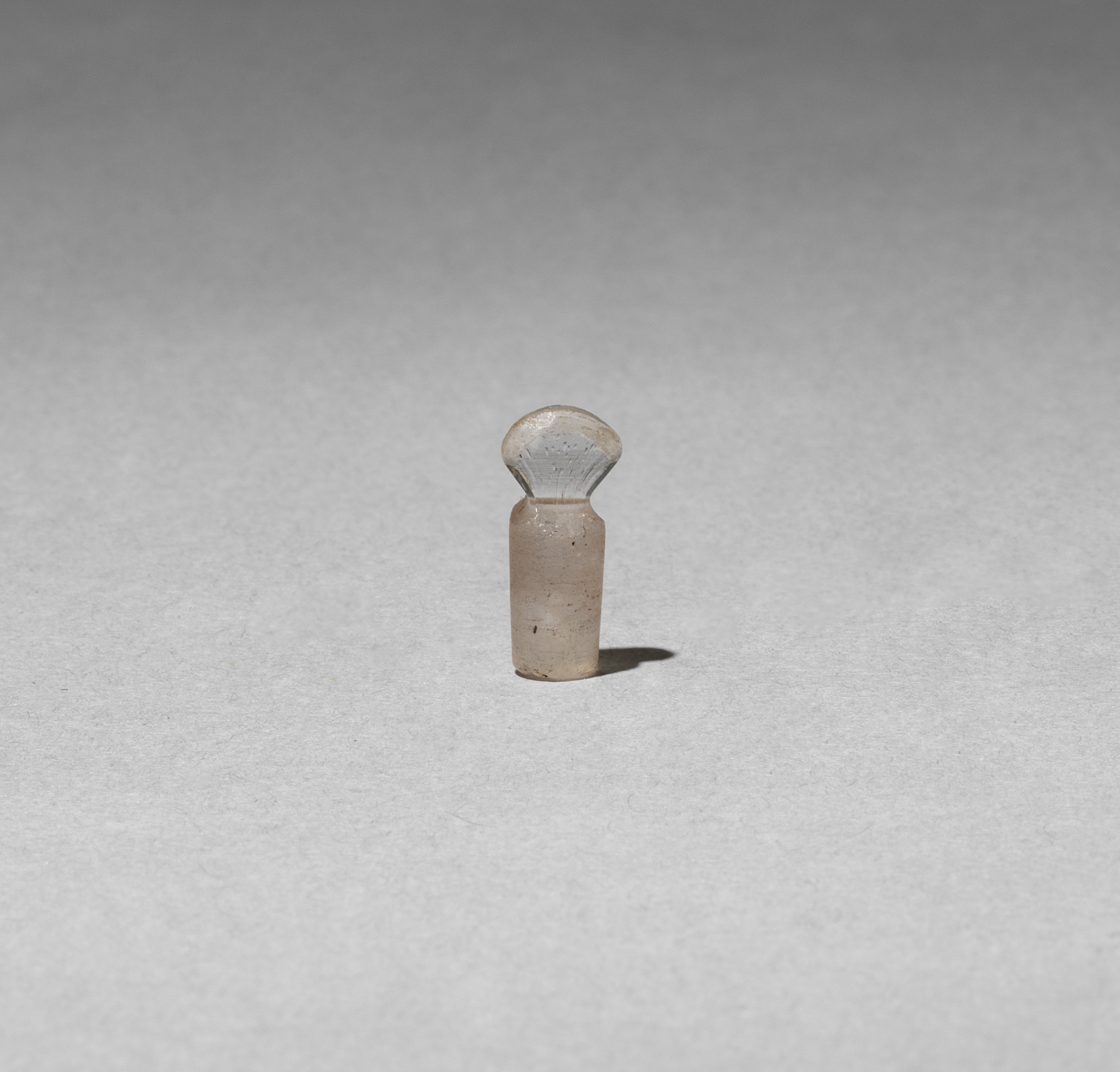 The image shows a small, cylindrical object with a rounded top. The object is made of a light-colored material, possibly glass or stone. The object is a stopper for a scent bottle by an unknown artist titled "Stopper for a Scent Bottle". The stopper is small and cylindrical with a rounded top. The top is wider than the base and has a slight indentation in the center. The stopper is a light beige color with some darker spots and marks on its surface. The background of the image is a plain gray surface, which helps to highlight the details of the stopper. The overall atmosphere of the image is one of simplicity and elegance, suggesting that the stopper is a delicate and refined object.