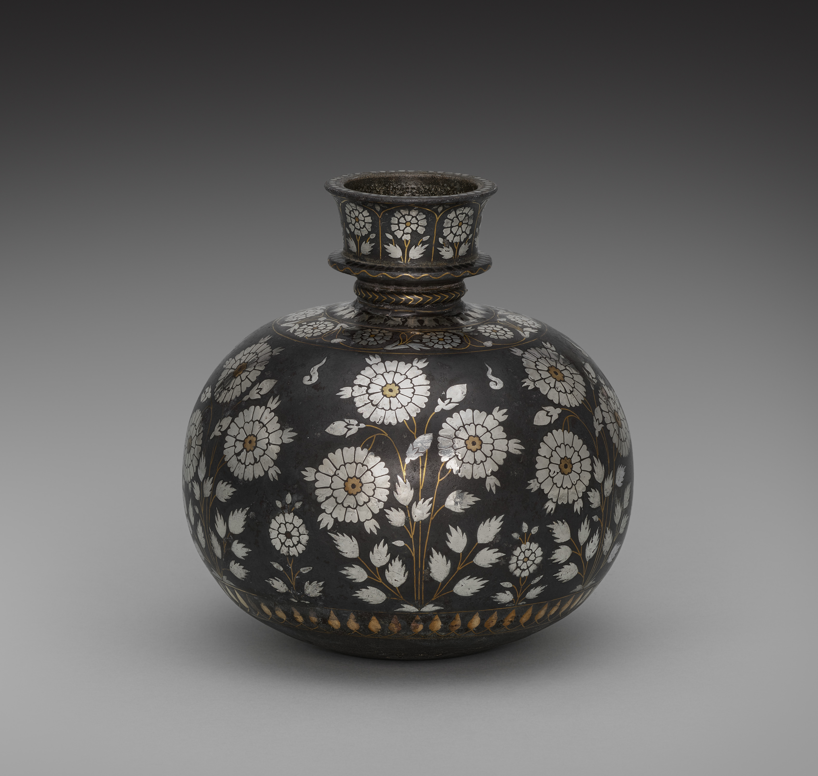 Black vase with rounded body, short neck and flared mouth. White floral inlays with gold details depicting roses and leaves. The inlays form a pattern around the entire vase. A gold and black wave design on a black and gold band encircles the base of the neck. A geometric pattern in gold encircles base. The background is grey gradient. The piece is titled "Bidri Hookah Bowl with Roses".