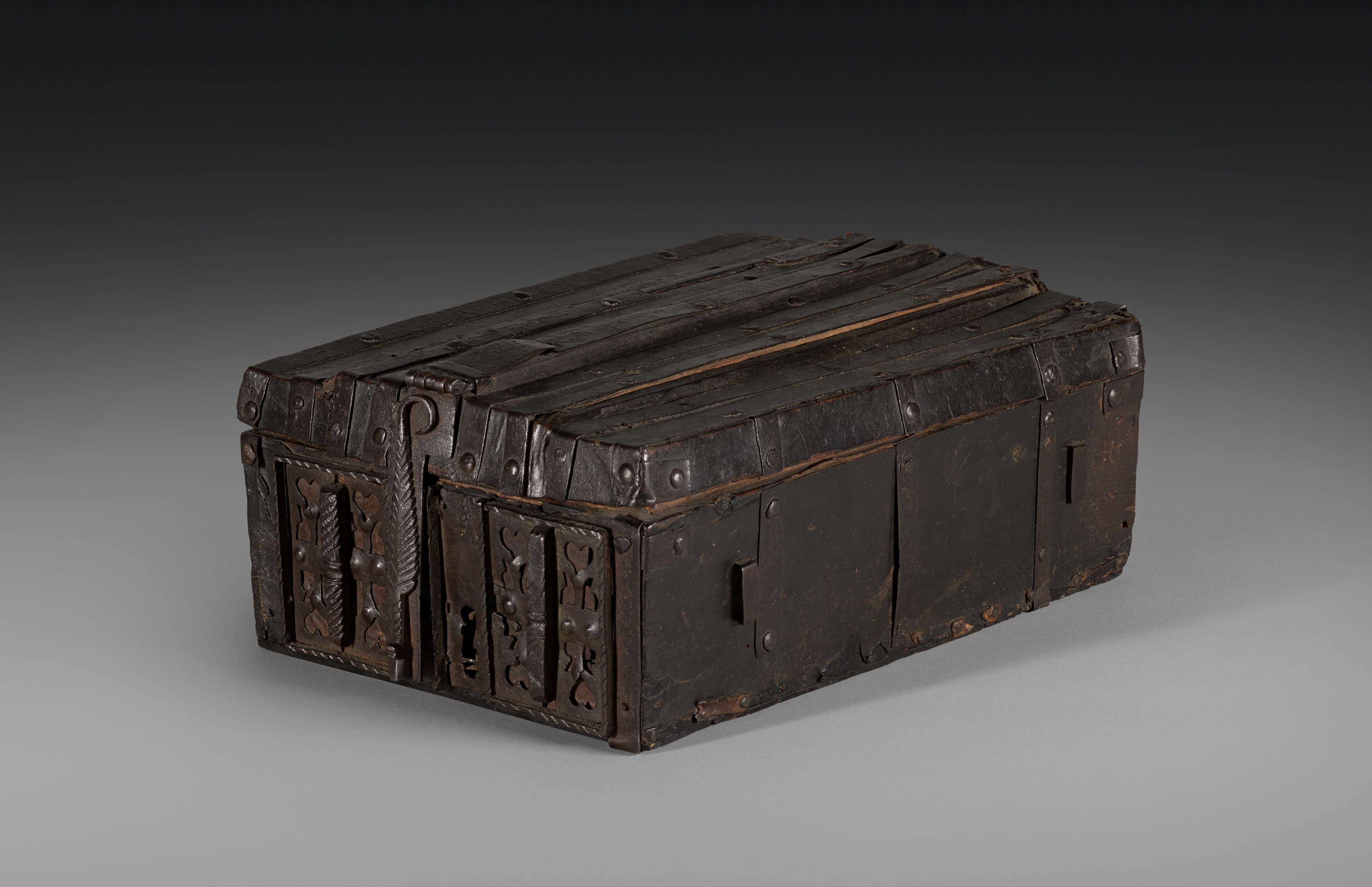 Rectangular, dark-colored, wooden box with metal straps and rivets. The box has a flat top and straight sides. Metal bands run along the top and sides. A metal plate on the front has a patterned design. The box is adorned with a metal handle on the front. The box exhibits signs of wear and aging. A woodcut image of Saint Veronica's Vernicle is on the top. The box is by Hans Burgkmair the Elder.