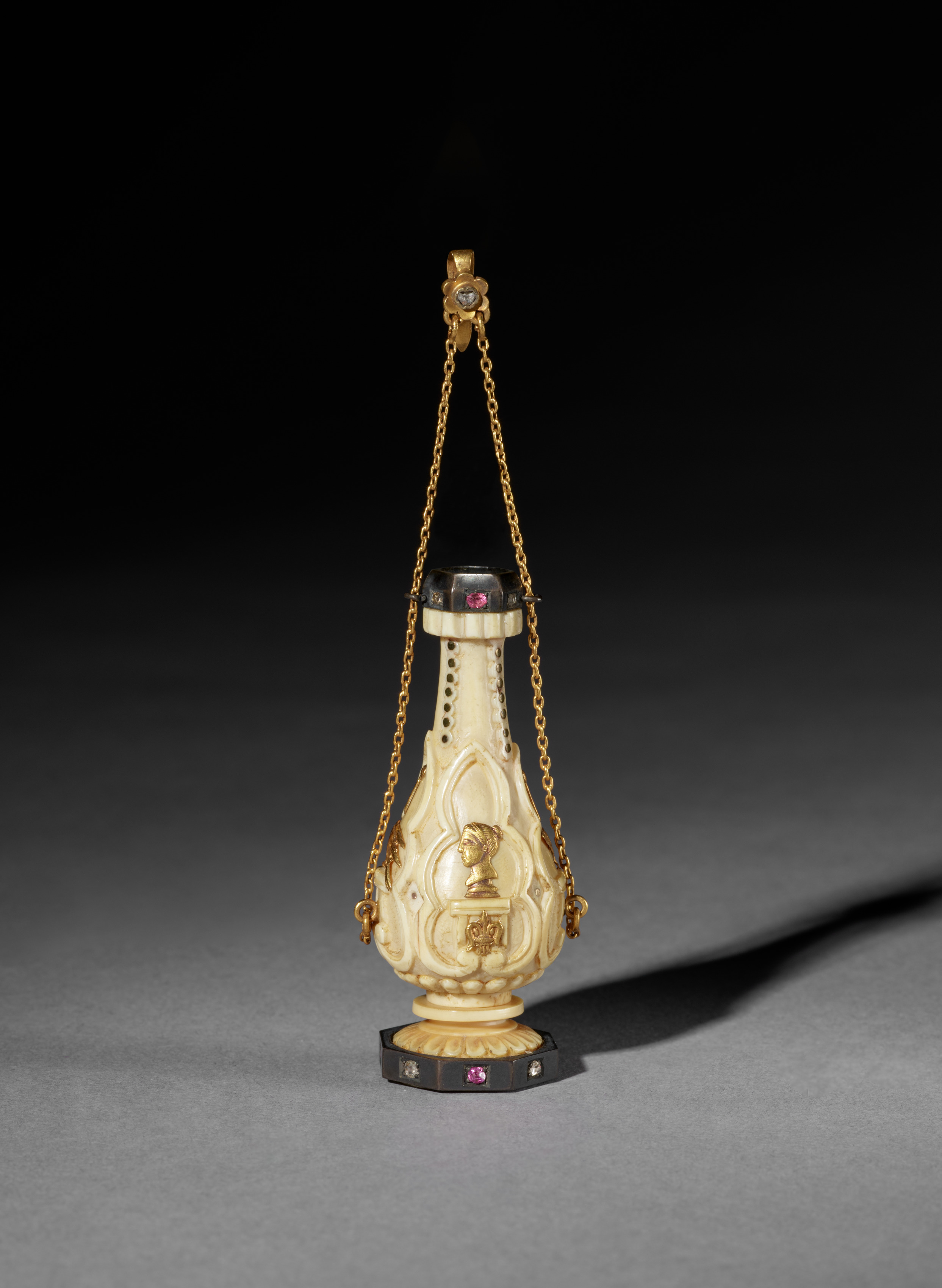 The object is a perfume or scent bottle. It has a white, carved body with a floral pattern and a black top and base. The top and base have small, pink and clear gemstones set into them. A gold chain is attached to the top of the bottle, which has a gold clasp with a clear gemstone. The bottle is sitting on a grey surface, and the background is black.