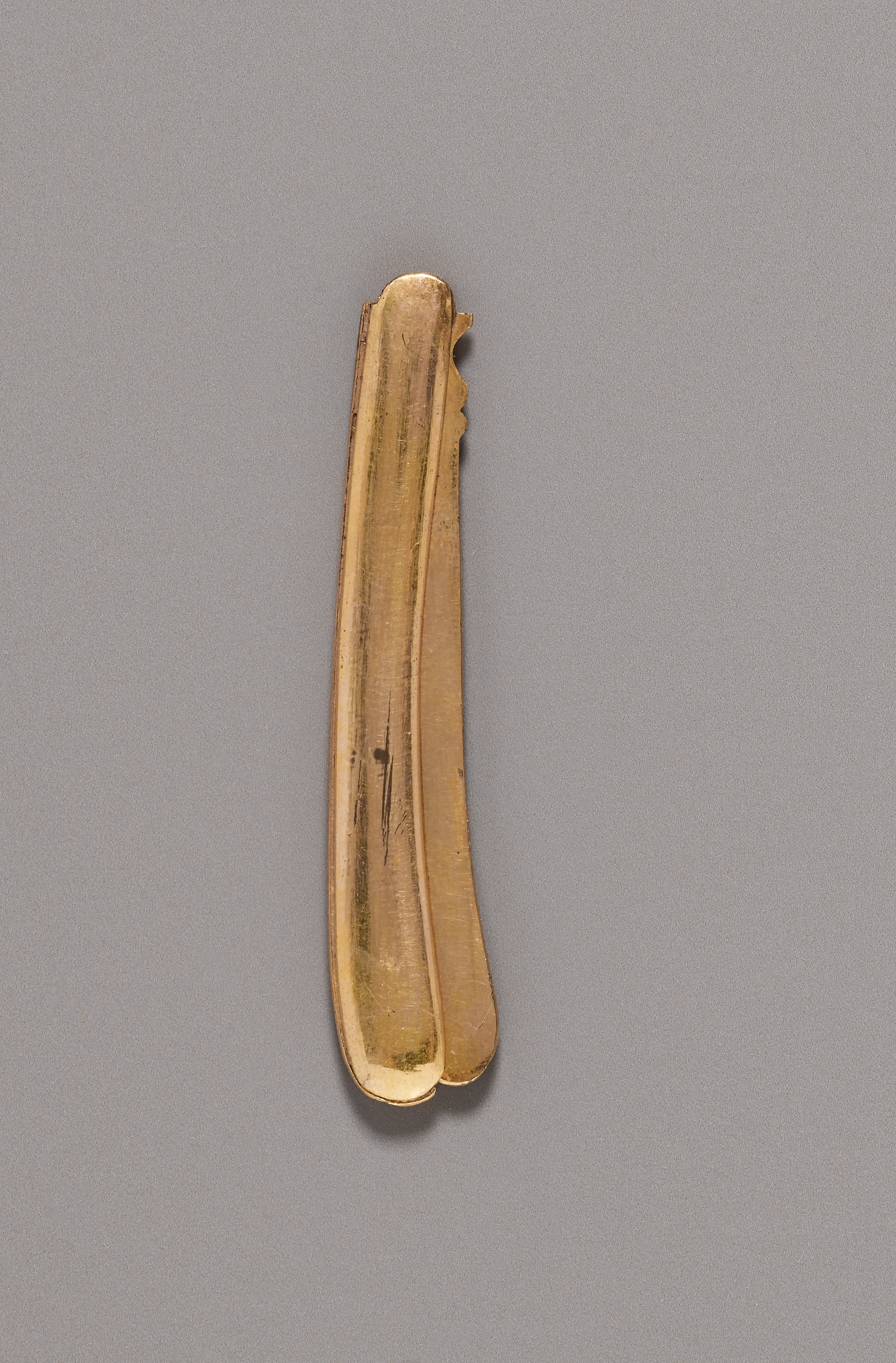 The image depicts a gold-colored metal object titled "Sharpening Blade" by an unknown artist. The object is long and thin, resembling a blade or tool. It has a curved shape with rounded edges and a small hole at the top. The object is made of a shiny, gold-colored metal with visible signs of wear and tear, including dark spots and scratches. The background of the image is a solid gray color.