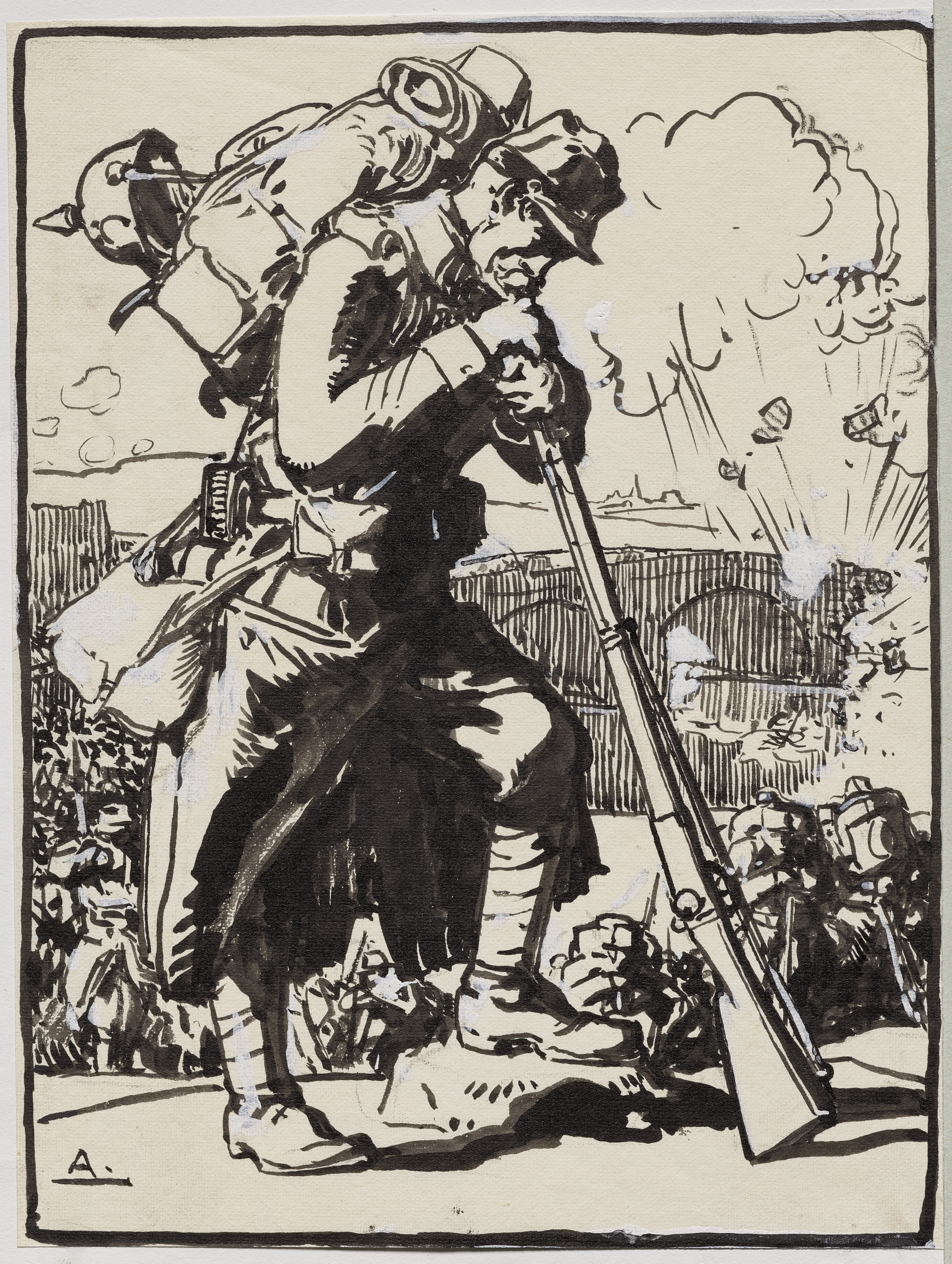 Black and white drawing of a soldier walking while carrying a large backpack and a rifle. The soldier wears a helmet and a gas mask. He walks to the right. In the background, there are several other soldiers and an explosion. The image is bordered by a thick black line. The background of the image is beige.
