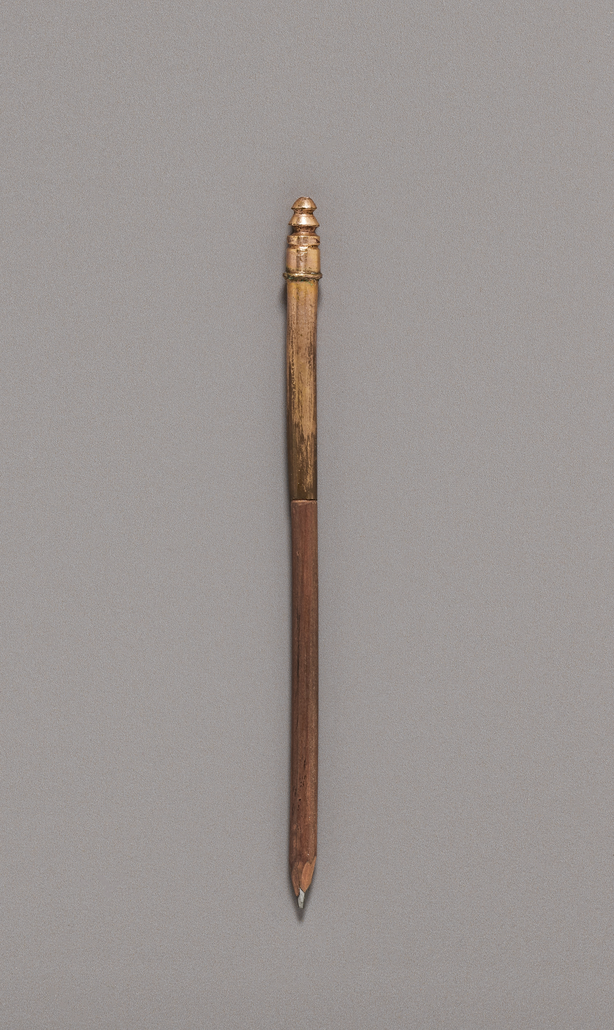 The image shows a pencil by artist Pencil. The pencil has a wooden body with a pointed tip. The top of the pencil is gold-colored and has a small ball on top. The gold portion is cylindrical with a decorative shape at the very top. There is a thin metal band around the pencil below the decorative shape. The background of the image is gray.