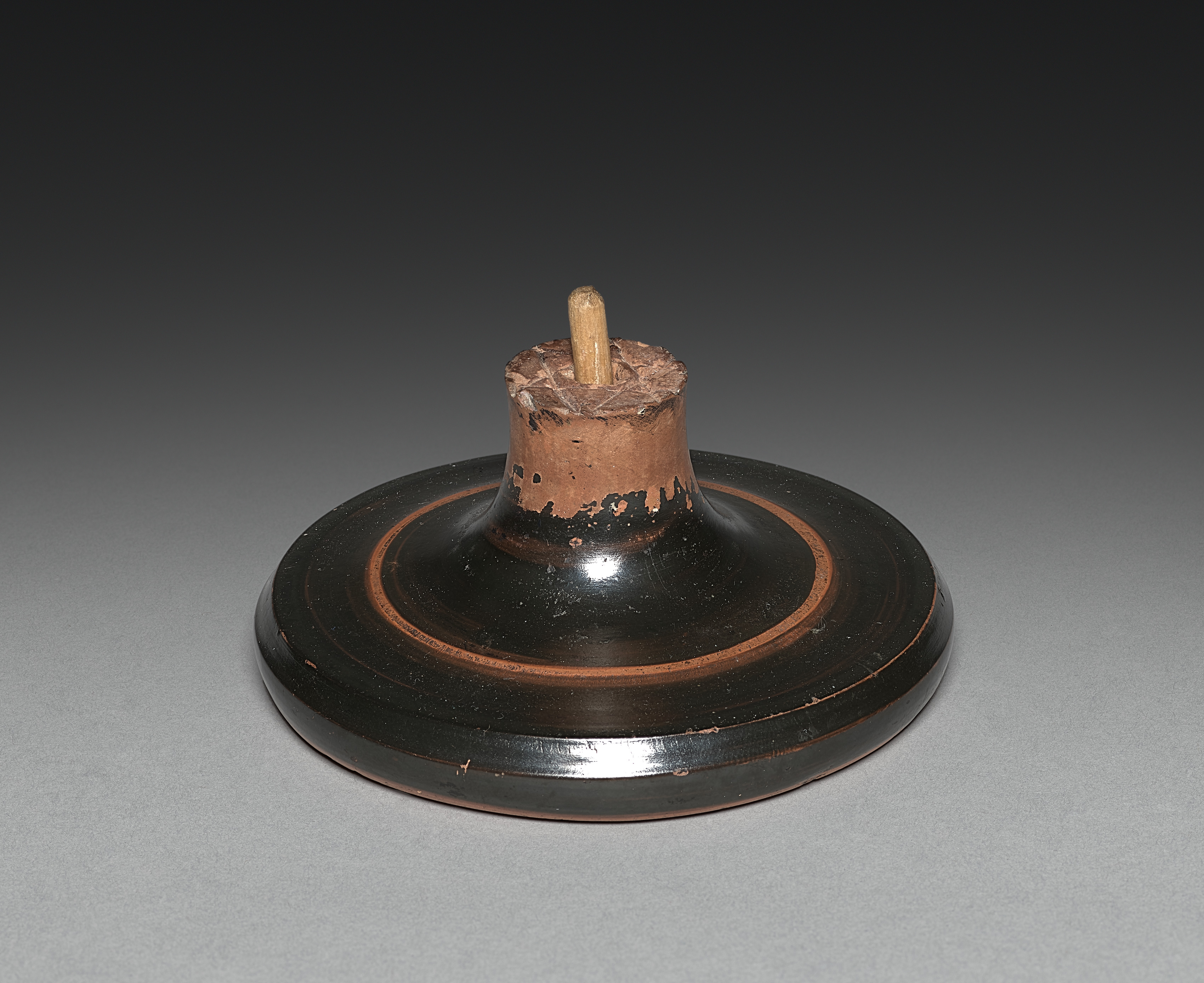 The Foot from Red-Figure Kylix (Drinking Cup) by Artist is a circular, flat base with a short cylindrical protrusion in the center. The base is predominantly black with two thin, light-brown rings around the edge. The cylindrical protrusion is light brown with some darker brown areas and a small, cylindrical piece extending from the top. The base and protrusion are made of clay, showing signs of wear and aging. The background is a gradient of dark gray to light gray. The overall shape is a low, wide cylinder with a flat base.