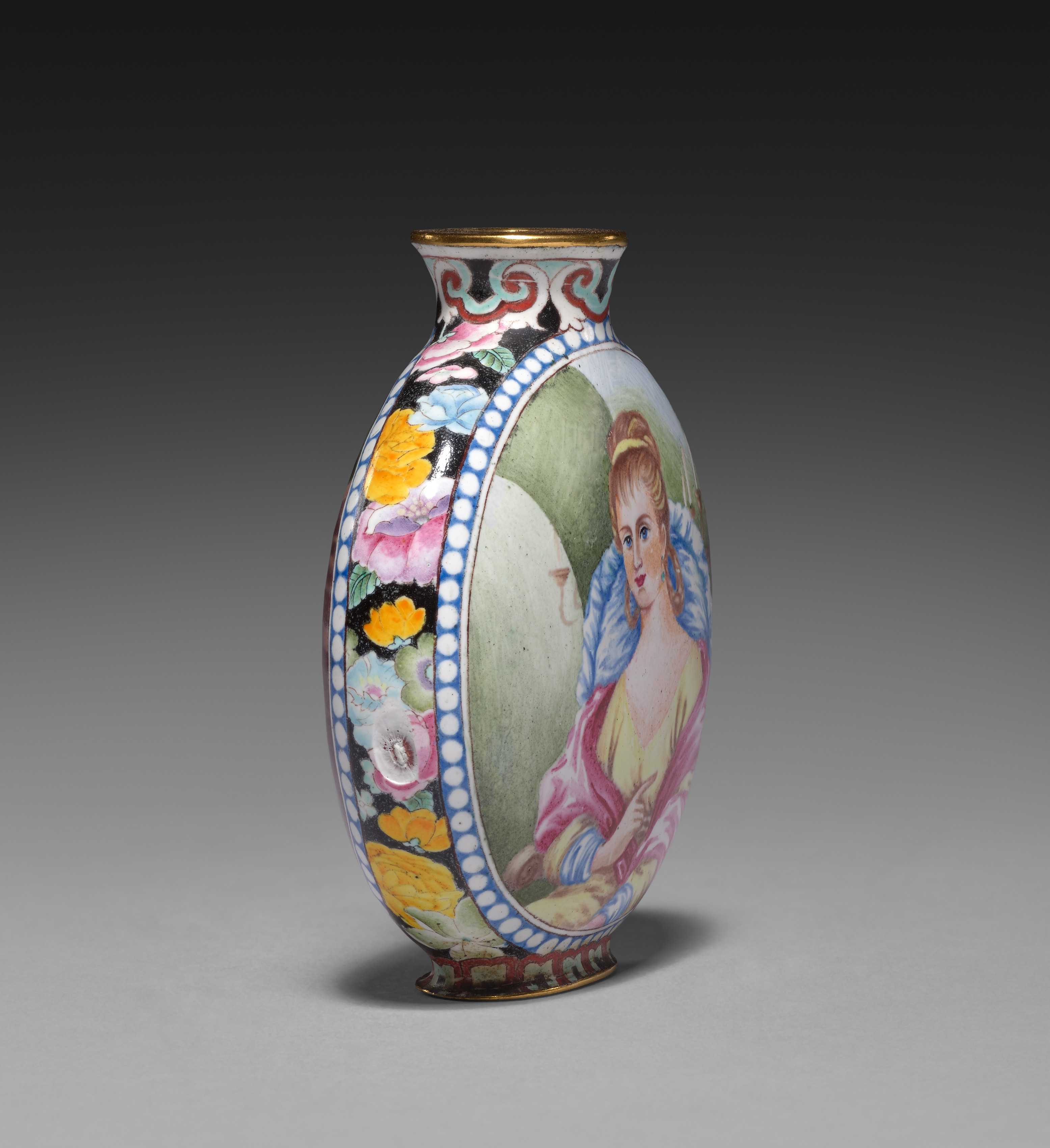 Oval-shaped vase with a narrow neck and flared mouth featuring a gold rim. The vase has a flat base and is predominantly white with a colorful design. The design consists of a blue and white dotted border surrounding a panel on one side depicting a European woman in a yellow dress with a pink shawl and blue cloak. The panel on the other side features colorful flowers on a black background. The neck of the vase has a colorful scroll design on a black background with red, blue, pink, and green swirls. The base of the vase has a red and gold design. The background of the image is a dark gray gradient.