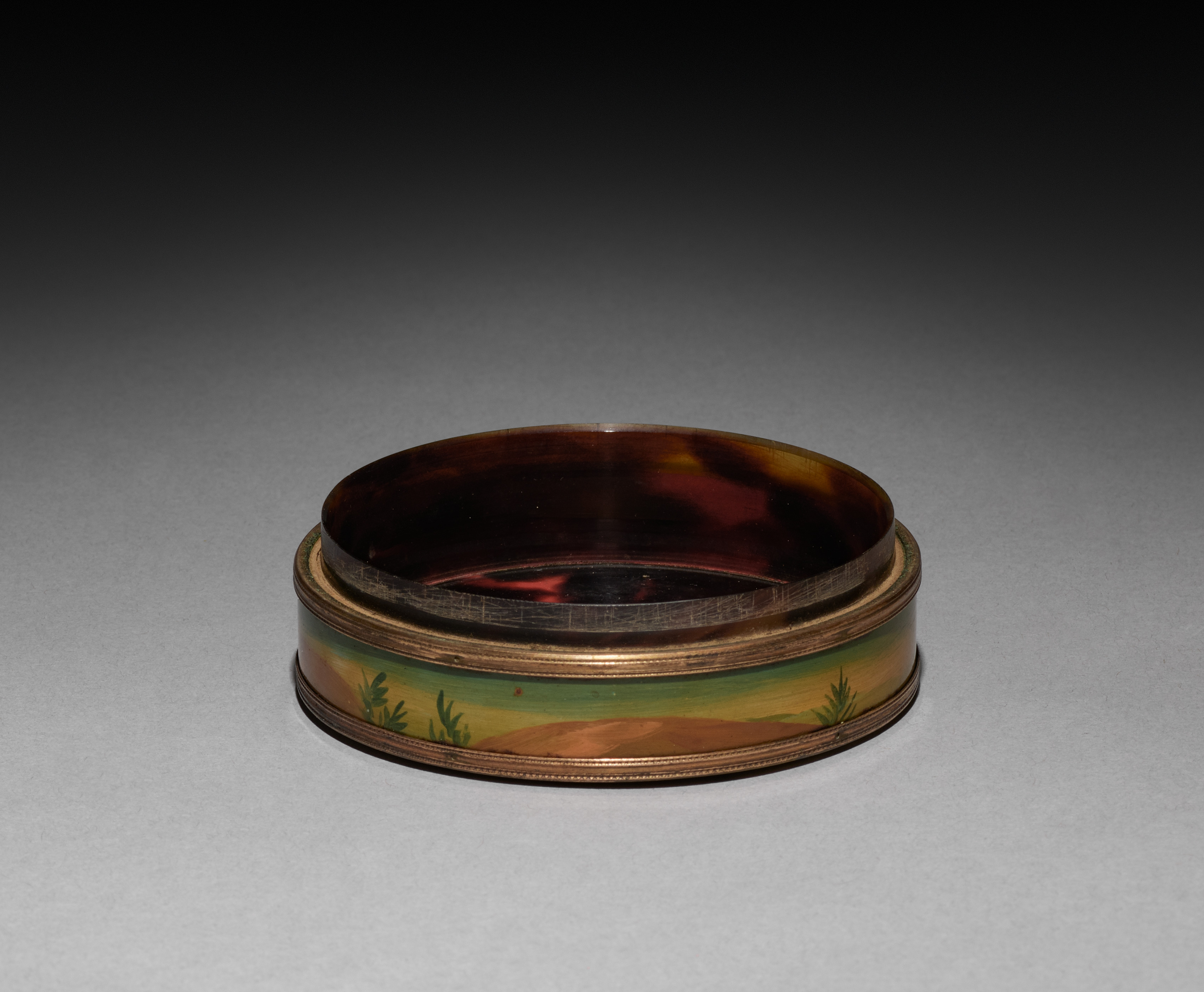 Round box with a tortoiseshell lid, artist Joseph C. Burroughs. The box has a gold rim and a painted scene around the middle depicting a landscape with green plants, a brown hill, and a yellow and green sky. The box is on a gray background.