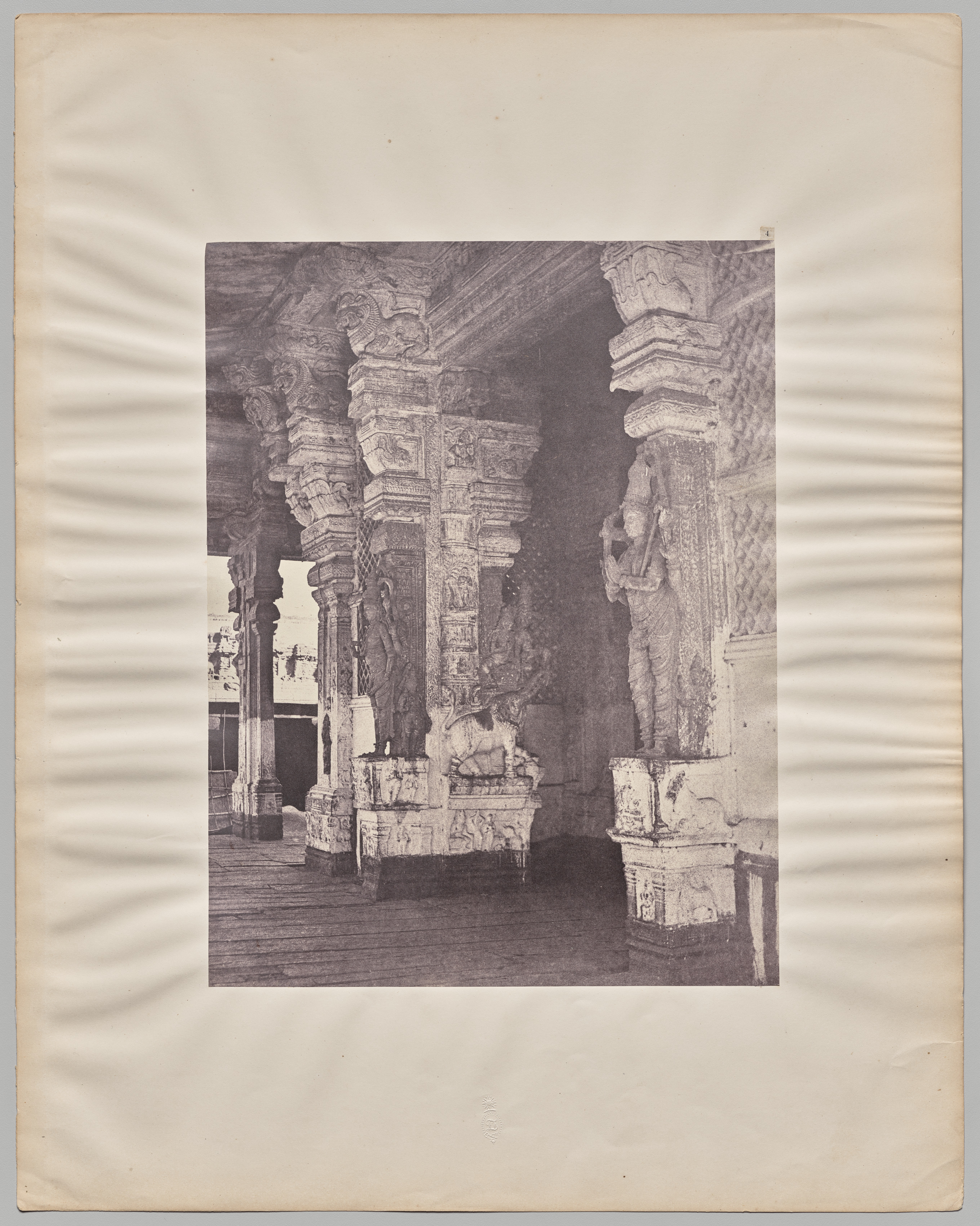 Black and white photograph of a covered walkway with intricately carved stone pillars. The pillars have ornate designs and statues on them. The pillars are square bases with ornate carvings and statues. The ceiling is made of stone and has a decorative design. The floor is made of stone or tile. The photograph is mounted on a beige background with wavy lines. The image is in black and white. The photograph appears to be old and worn.