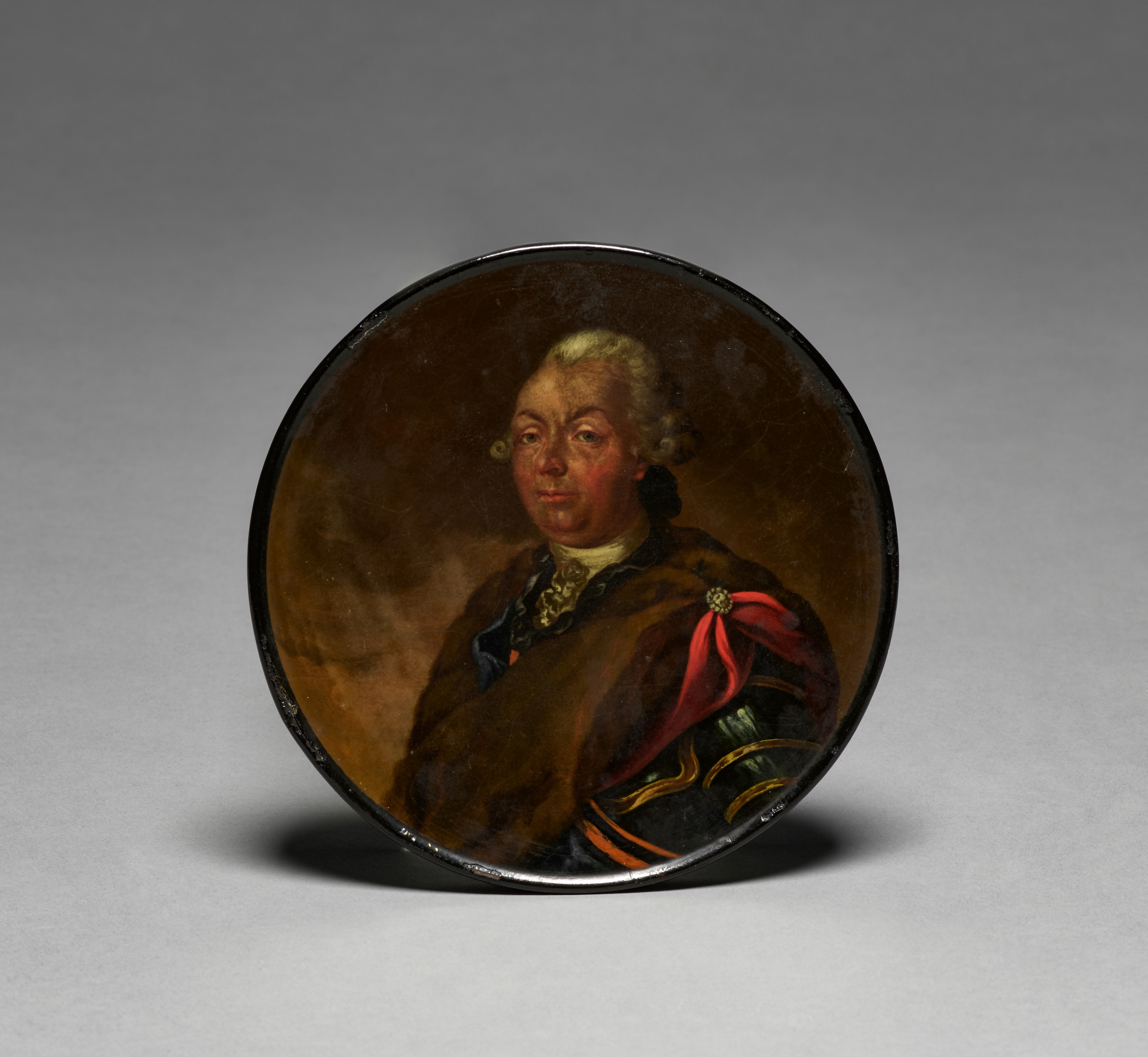 Round, flat object with a black rim, containing a painted portrait. The portrait is of a man with light-colored hair, wearing a brown shawl or cape, a white neckcloth, and a dark-colored military-style jacket with gold accents and a red ribbon on the shoulder. The background of the portrait is brown. The object sits on a gray surface with a shadow underneath. The background behind the object is gray and darkens towards the top.