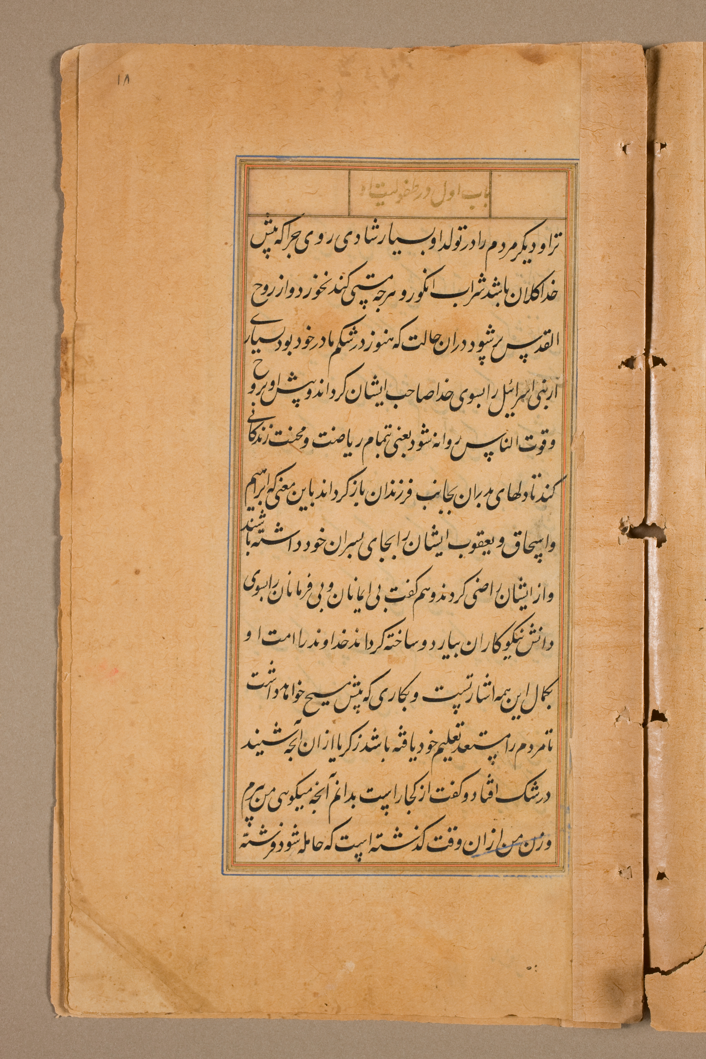 Yellowed, aged paper with darker edges, presenting a worn appearance. The page displays black text written in a non-Latin script, likely Arabic or Persian, arranged in lines. A blue border surrounds the text, encompassing most of the page. The right edge shows signs of wear and tear, with darker areas suggesting handling. Three holes are visible on the right side, likely from binding. The background is plain and grey.