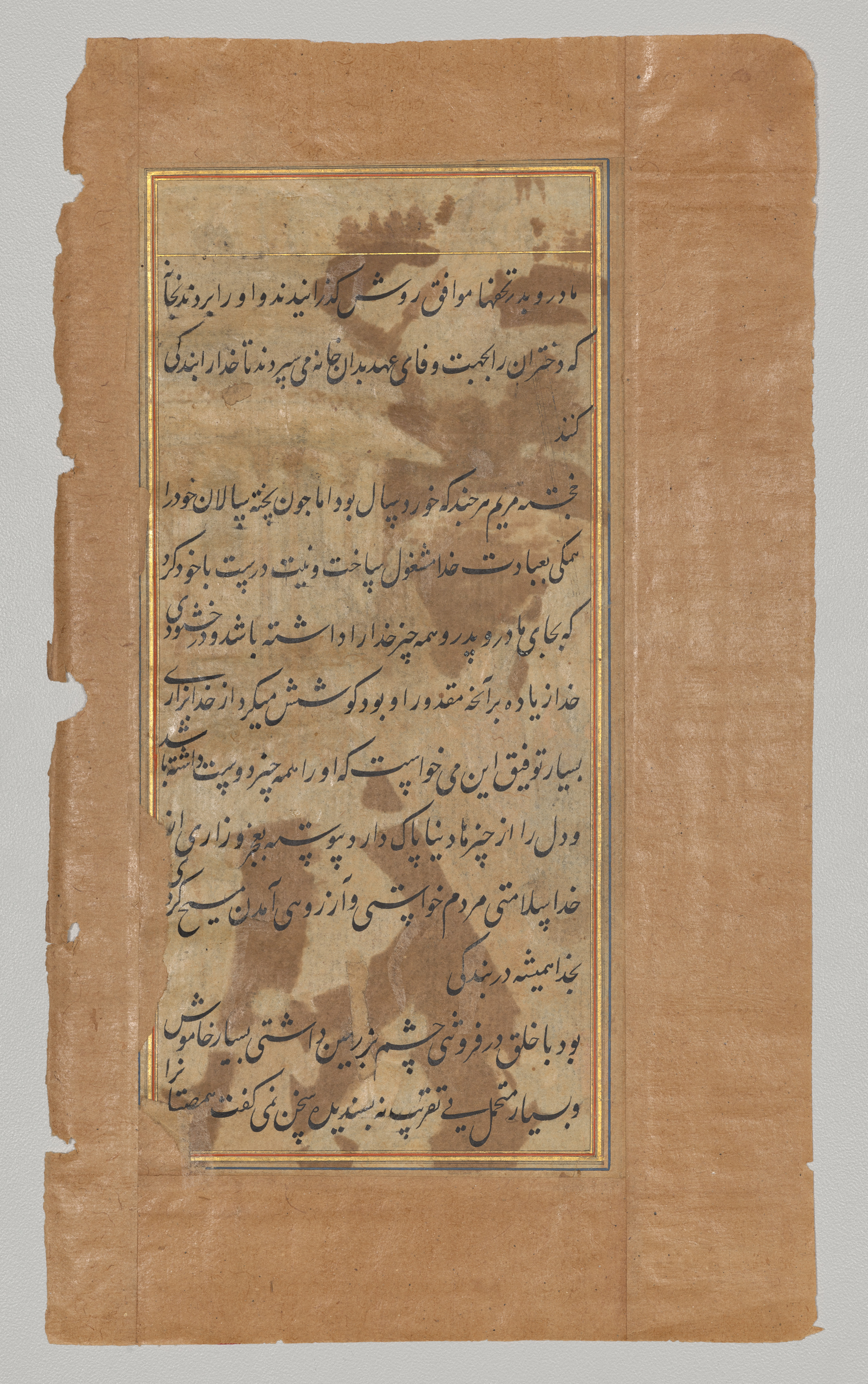 Brown paper with a central rectangular text area, surrounded by a thin gold border and a slightly thicker blue border. The text is written in black ink in a foreign script, possibly Arabic or Persian, and appears to be in a formal or calligraphic style. The paper has a rough, aged appearance with visible signs of wear, including tears along the edges, dark brown and black stains, and a crease down the center. The background behind the paper is light gray.