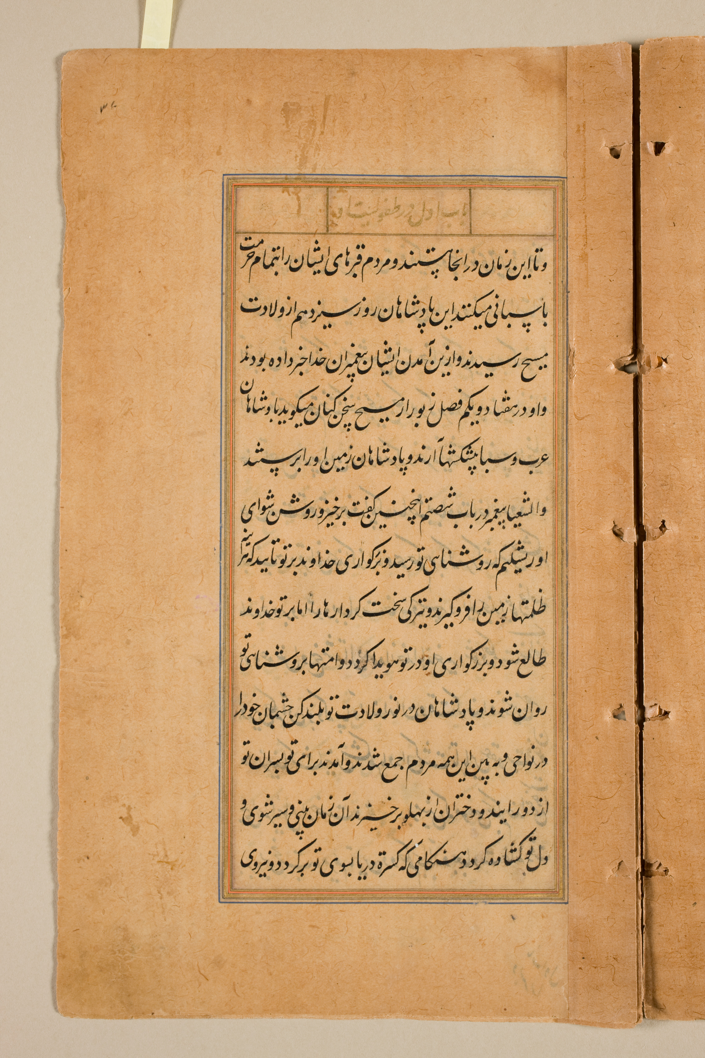 A yellowed, aged book page with a central rectangular text box filled with black, written text in a foreign language, likely Arabic or Persian. A thin blue border outlines the text box. The page edges are worn and brown; a tab of paper protrudes from the top left; and the right side shows holes and wear, with the page slightly folded or bent. The background behind the page is uniformly light gray.