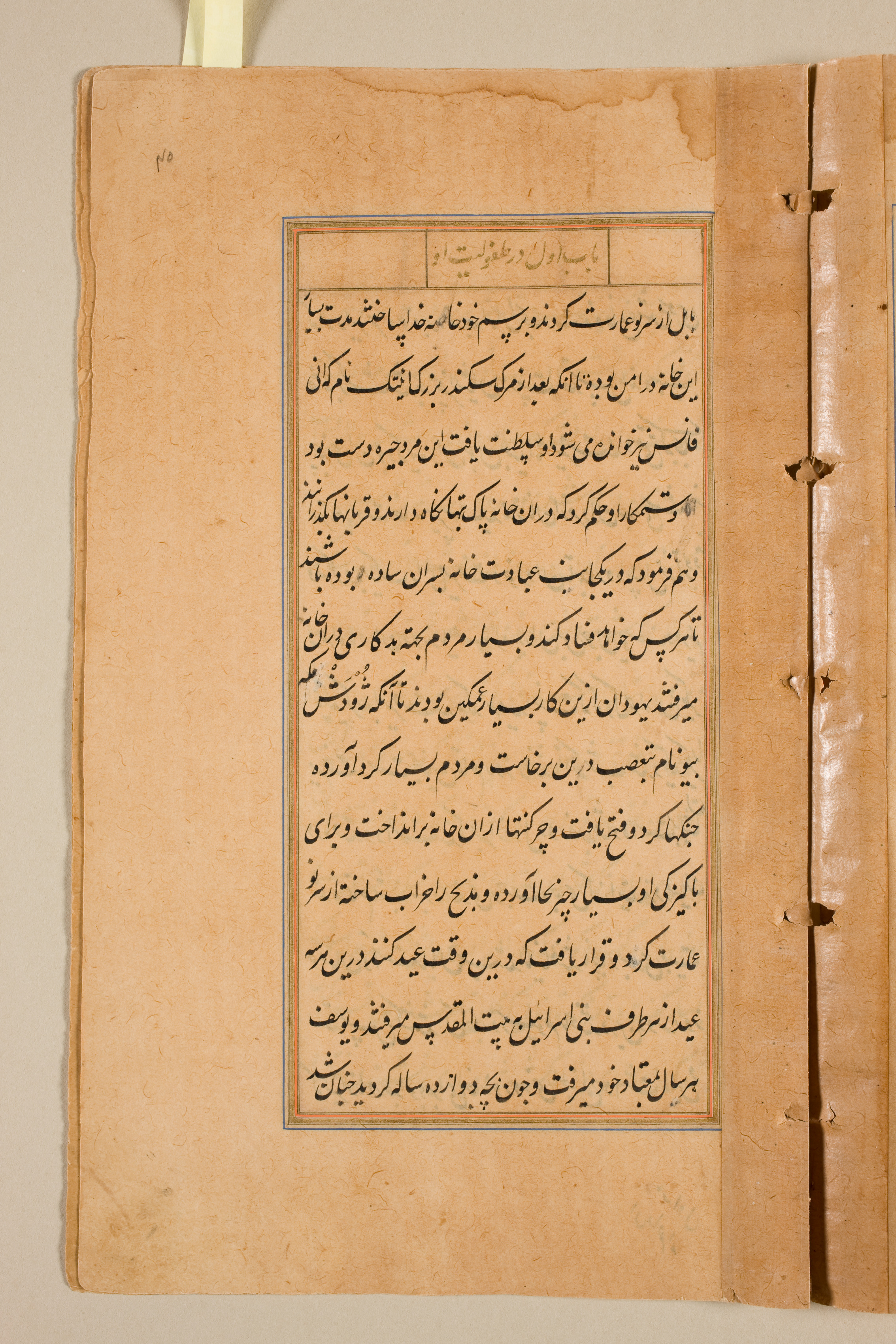 A page from a book written in Arabic script, likely Persian. The page is yellowed with age and has a rectangular border around the text. The text is written in black ink. The border is blue and there is a small rectangular box at the top. The page is slightly torn on the left side and has a few holes along the right side. Three holes are visible and appear to have been made by a binder or stitching. The background of the image is a plain beige color. A pale yellow tab is visible on the left at the top. The page appears to be old and worn.