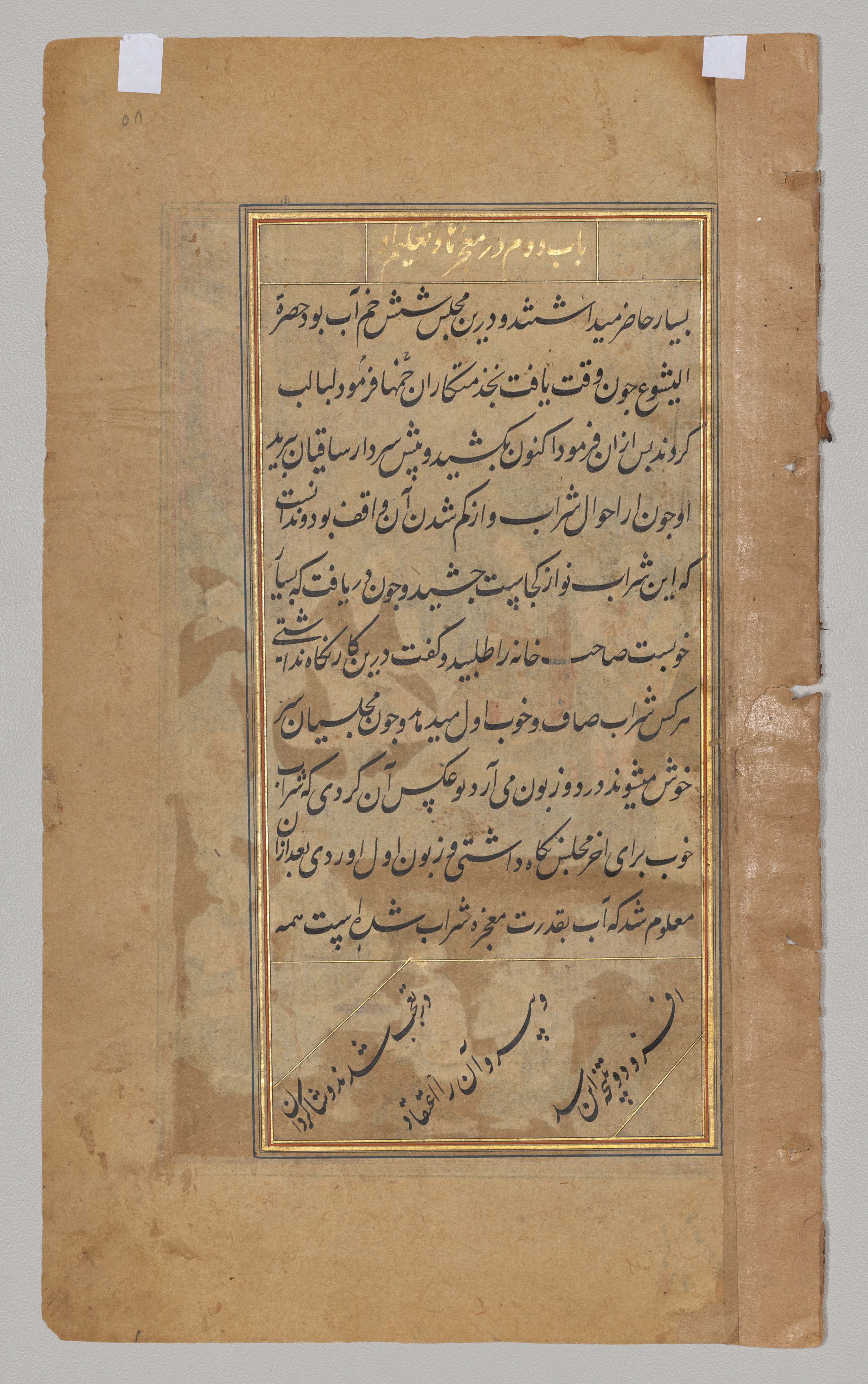 Brown paper page with darker brown spots and tears on the edges and right side; two pieces of white tape at top; rectangular gold and blue border; gold heading; black and gold text written in a right-to-left script; Arabic alphabet.