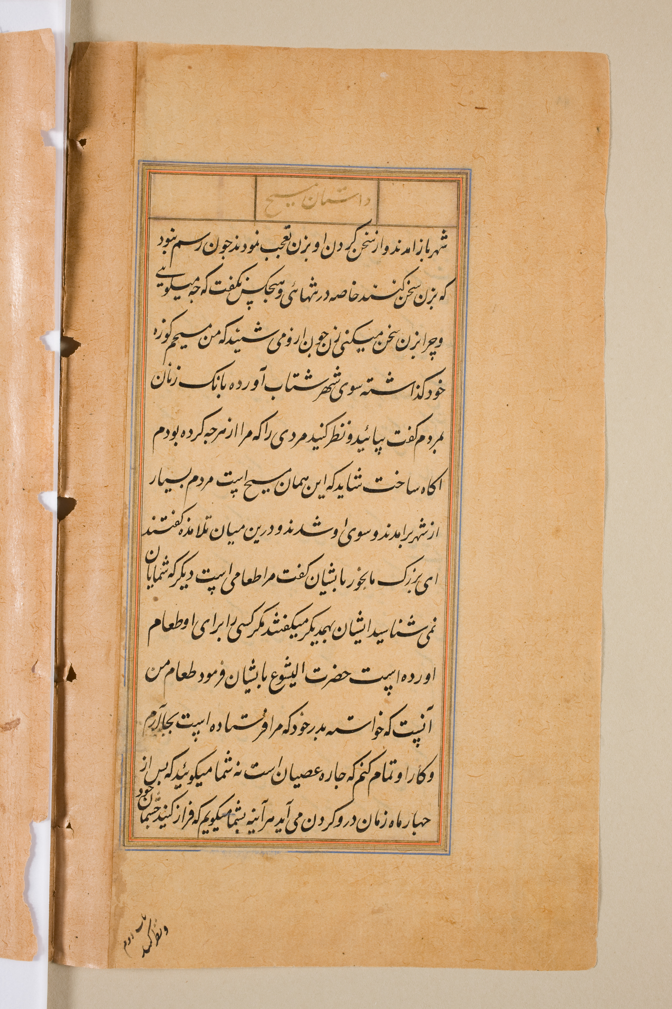 Brownish-yellow page with black text written in a non-Latin script, possibly Arabic or Persian, arranged in lines. The text is enclosed within a rectangular border, consisting of a thin blue line and a thicker red line. The top of the border features a smaller rectangular section with text. The page appears aged, with visible signs of wear, including tears along the left edge and discoloration. The background behind the page is beige. The page is positioned with the right side facing up and the left edge slightly turned.