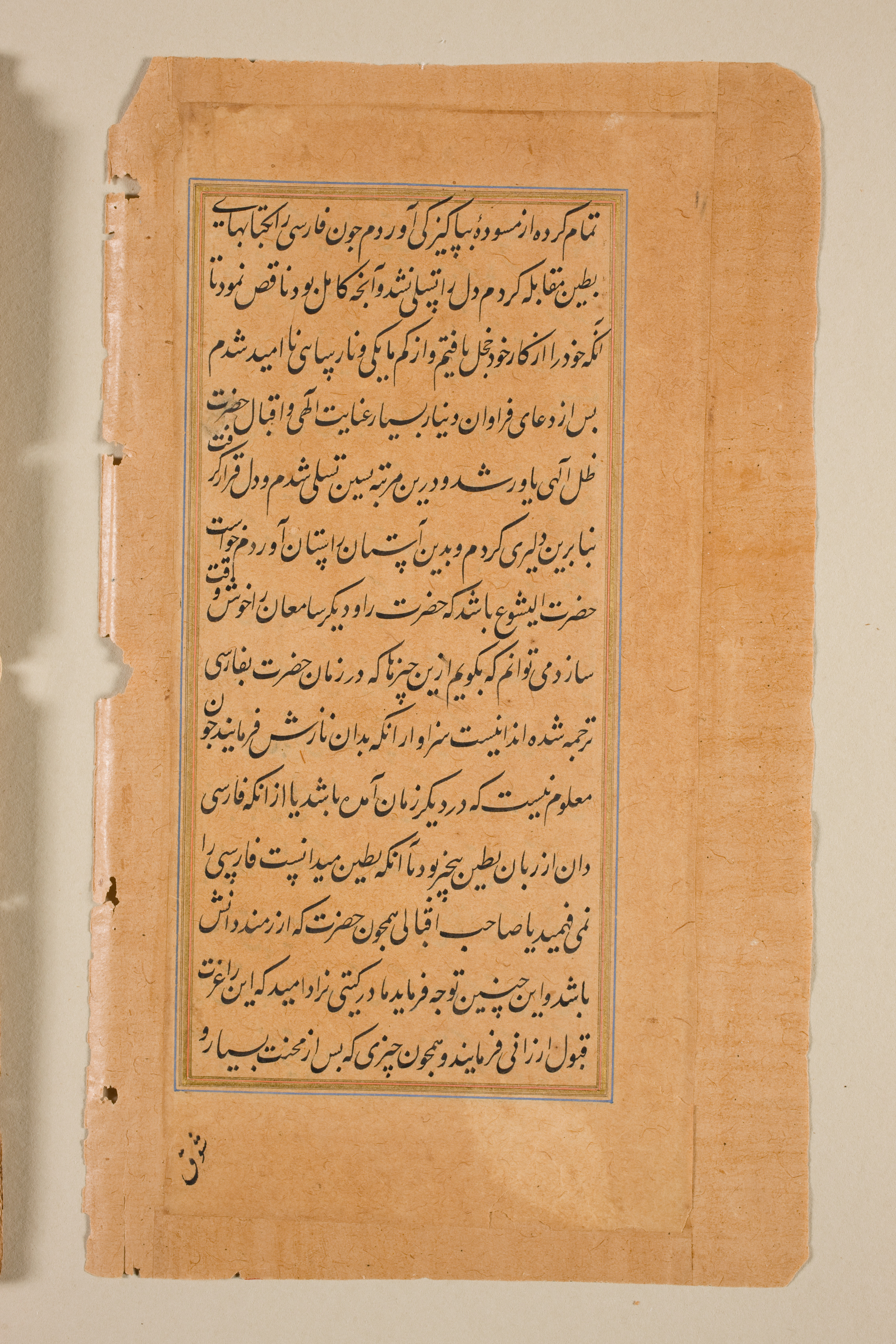 A yellowed, aged piece of paper with a central rectangular text area. The text area has a thin blue border. The page contains dense black script written in a language that appears to be Arabic or Persian. The script is arranged in lines, with the majority of the text in a smaller font size. The paper shows signs of aging, with visible discoloration and wear around the edges, some tears along the spine area on the left side, a hole on the left side near the bottom and on the bottom left corner the number 33 appears in black ink. The background behind the paper is off-white.