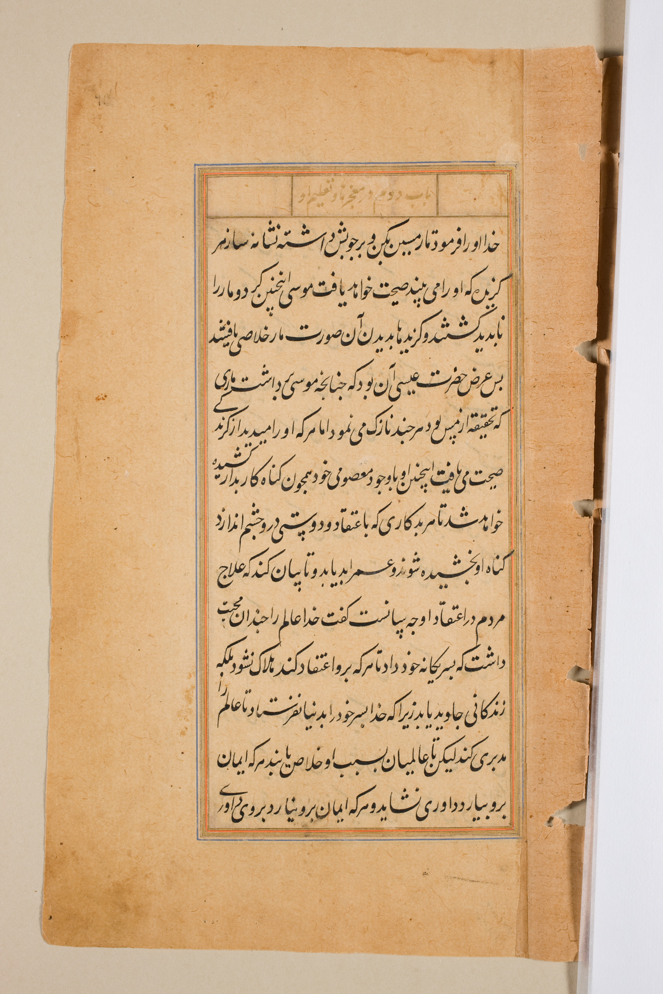 Yellowed, aged paper with writing in a non-Latin script, likely Arabic or Persian, presented in a single column. The text is enclosed within a thin blue and red border. Small tears and discoloration are visible along the edges. Three metal rings are attached to the right side. The background behind the paper is beige.