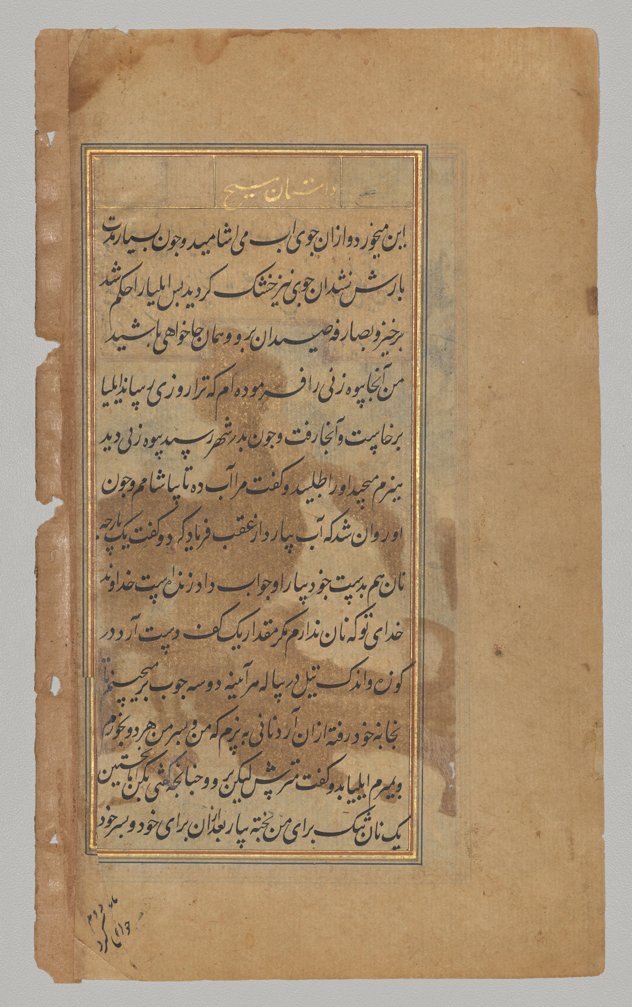 Brown page with a rectangular text box containing black Persian script, outlined in gold and blue. The text box is bordered by a thin gold line and a thicker blue line. Gold heading at the top of the text box. Page has a rough, aged appearance with torn and stained edges. Background behind the page is gray.