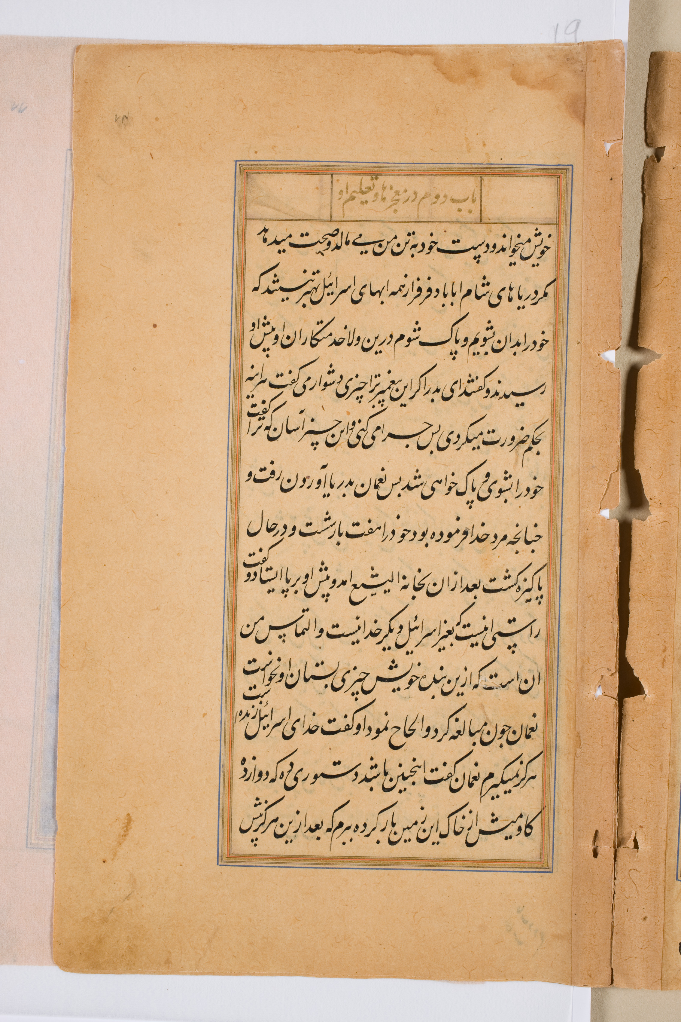 A page of a book with yellowed paper. The text area is rectangular with a thin blue border. The text area contains 33 lines of black ink text written in a script that is likely Nastaliq. The text is written in a language that appears to be Persian or Urdu. The text is arranged in a single column. A title or header is written in a smaller rectangular area above the main text. The page is torn on the right side, and there are signs of aging and wear.