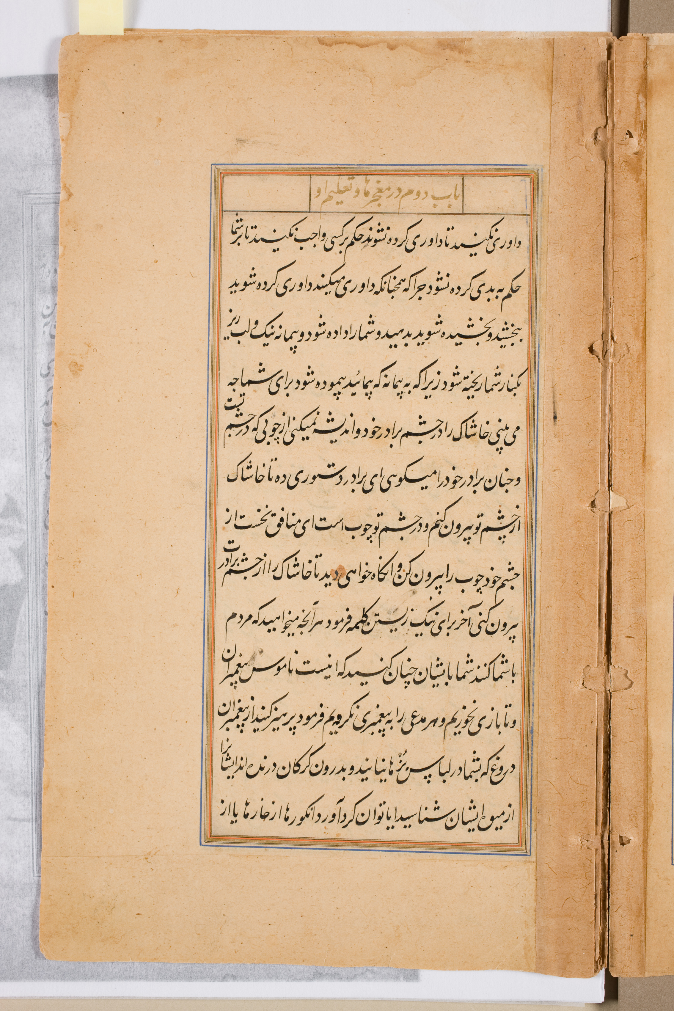 Yellowed, aged paper with a rectangular text box in the center, containing black text written in a non-Latin script, likely Persian or Arabic. The text box has a thin blue border. Small, illegible text is at the top of the page. The paper's edges are worn and torn, with darker spots and discoloration throughout. A crease runs down the center, and a rough, uneven edge is on the right side. The background is white, with a gray surface visible on the left.
