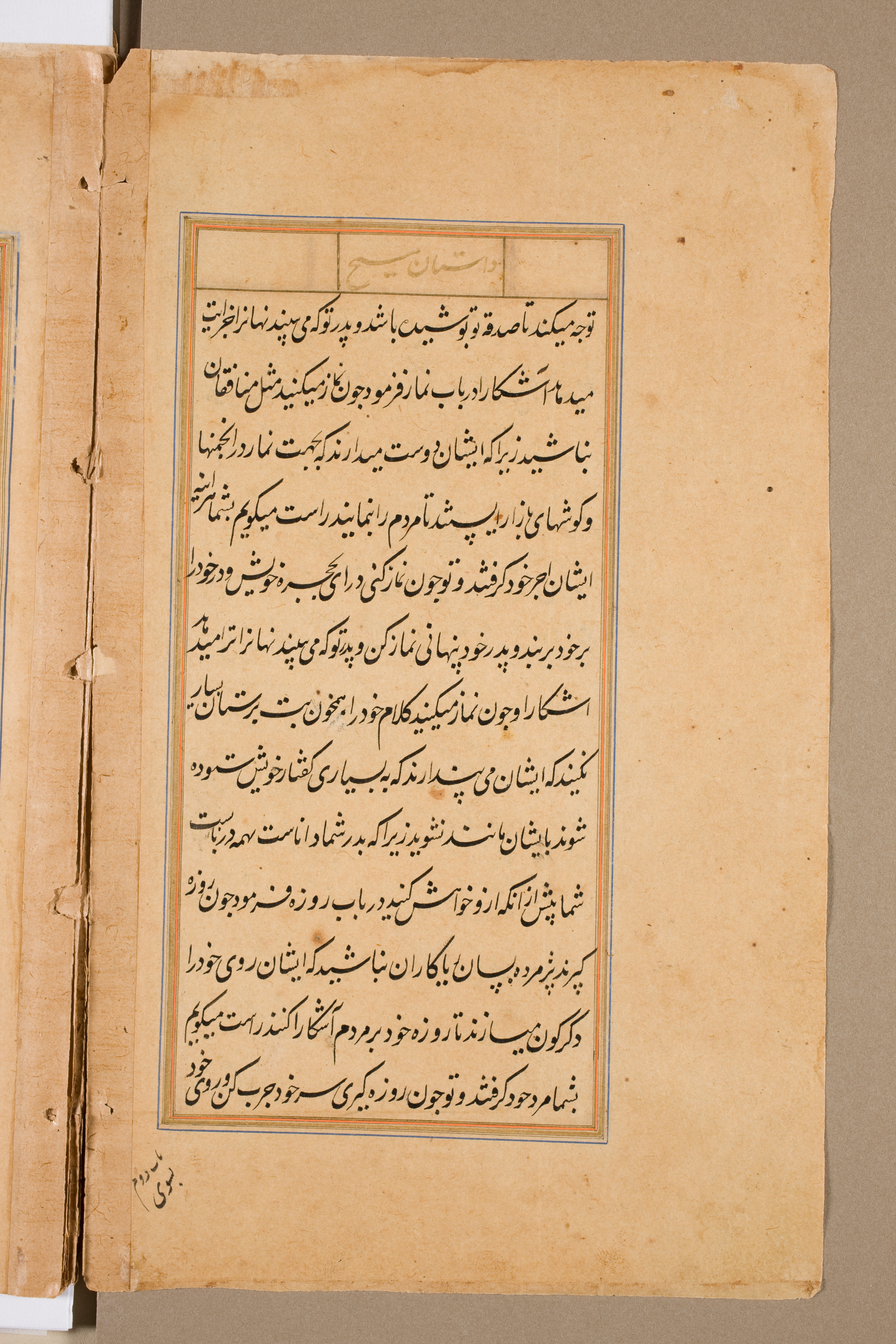 Yellowed, aged paper with darker spots and stains. Two pages are visible, with the left page partially shown. The right page has a rectangular text box containing black, cursive writing in a non-Latin script. The text box has a thin blue and orange border. The background behind the pages is solid taupe.