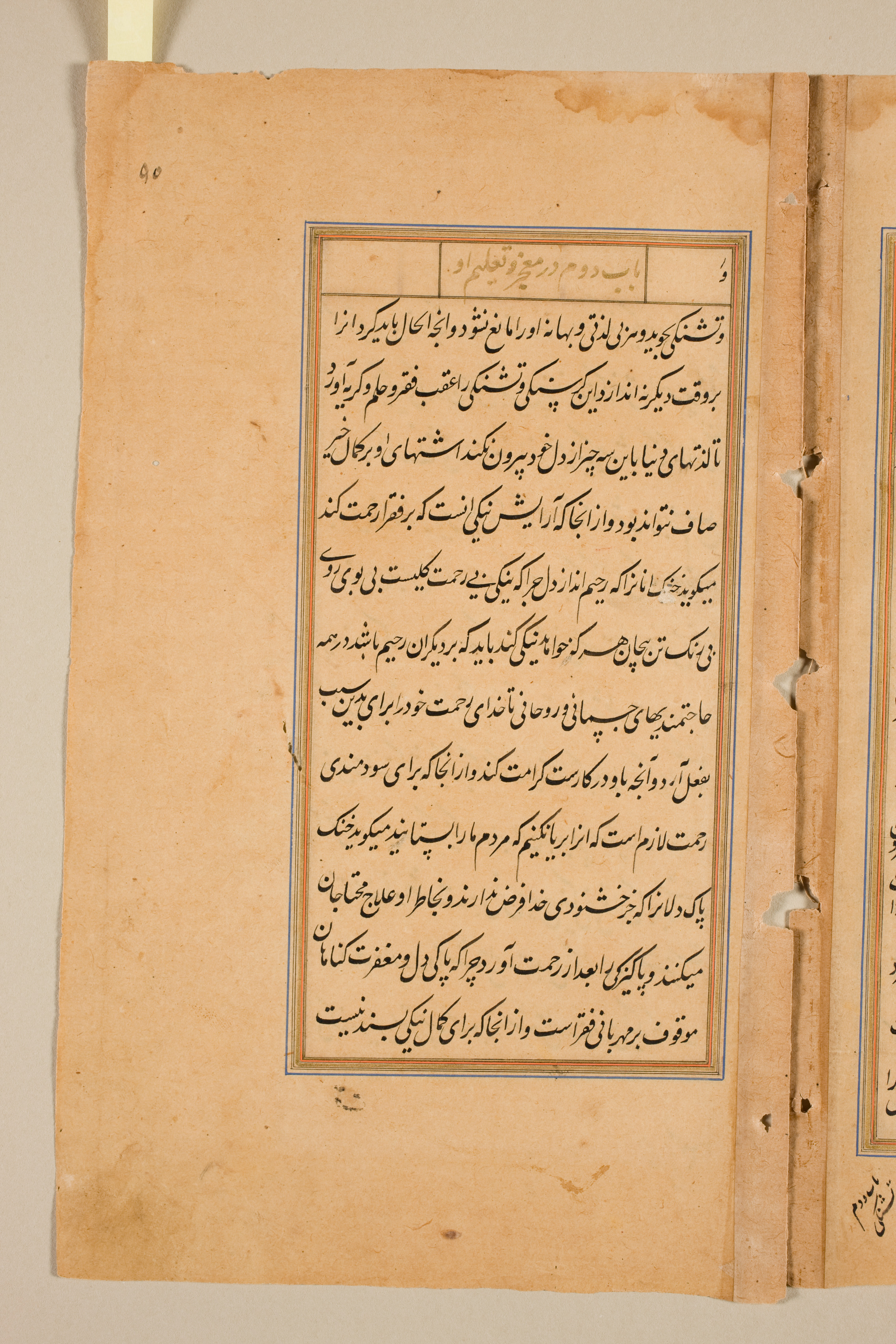 Yellowed, aged paper with darker spots and torn edges; right side edge has three evenly spaced holes; a darker line down the center where pages are bound; text written in black ink; a blue and gold border around the text; a small rectangle at the top with writing; right side of the image shows part of another page.