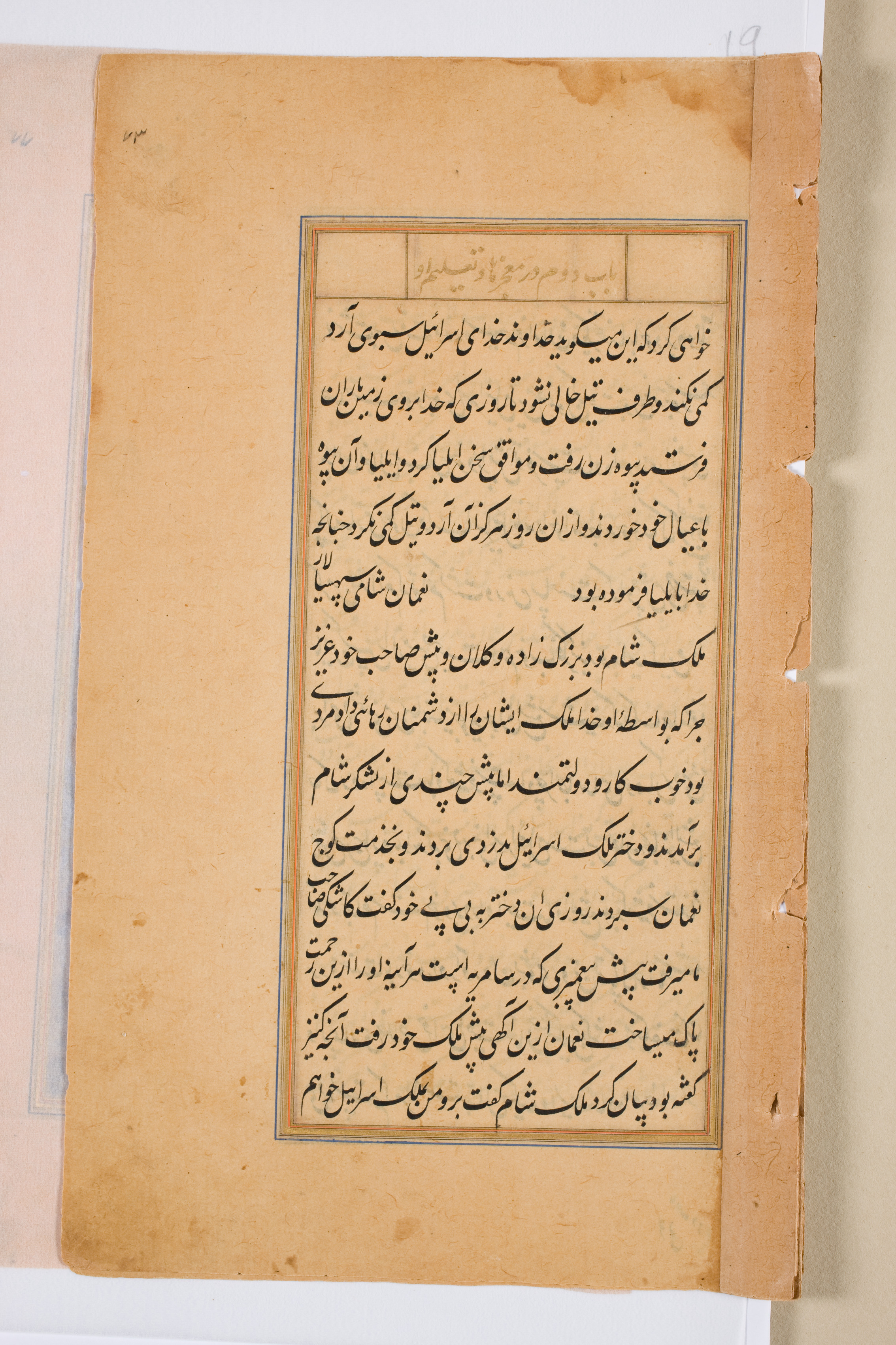 The image shows a yellowed, aged page with a central rectangular text box containing black script written in a language that appears to be Arabic or Persian. The text box has a thin blue border. The top of the page has a slightly darker yellow rectangle with more script. The page is slightly torn at the top and right edges, with small pieces missing. The page is set against a white background.