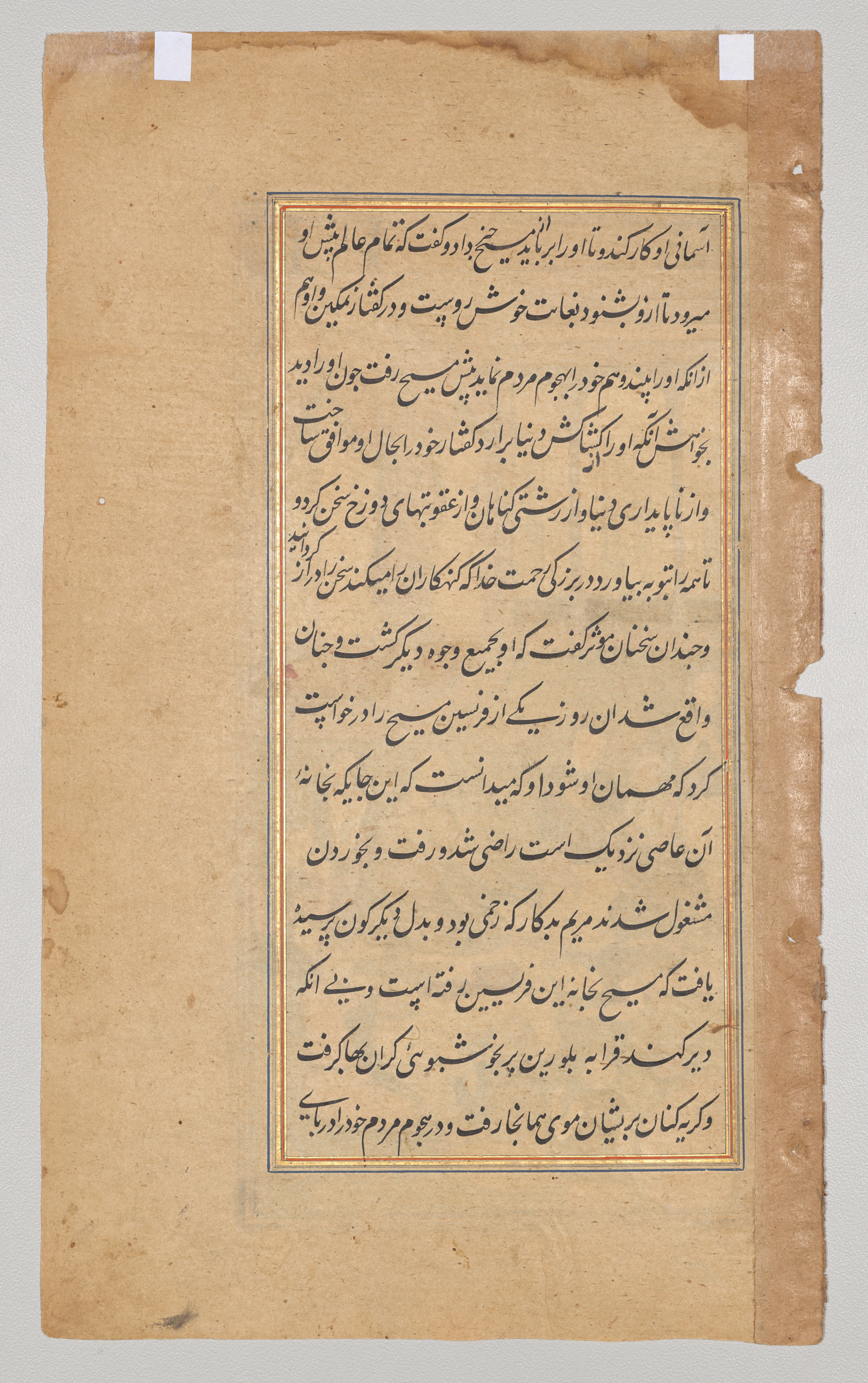 A page from a book with a light-brown background and darker brown edges. The page is rectangular with rough, torn edges and two small white pieces of tape at the top. A thin blue border surrounds a central block of text written in black ink. The text is in a non-Latin script, likely Arabic or Persian, and fills the central block. The text lines are mostly horizontal and evenly spaced. The background behind the page is light gray.