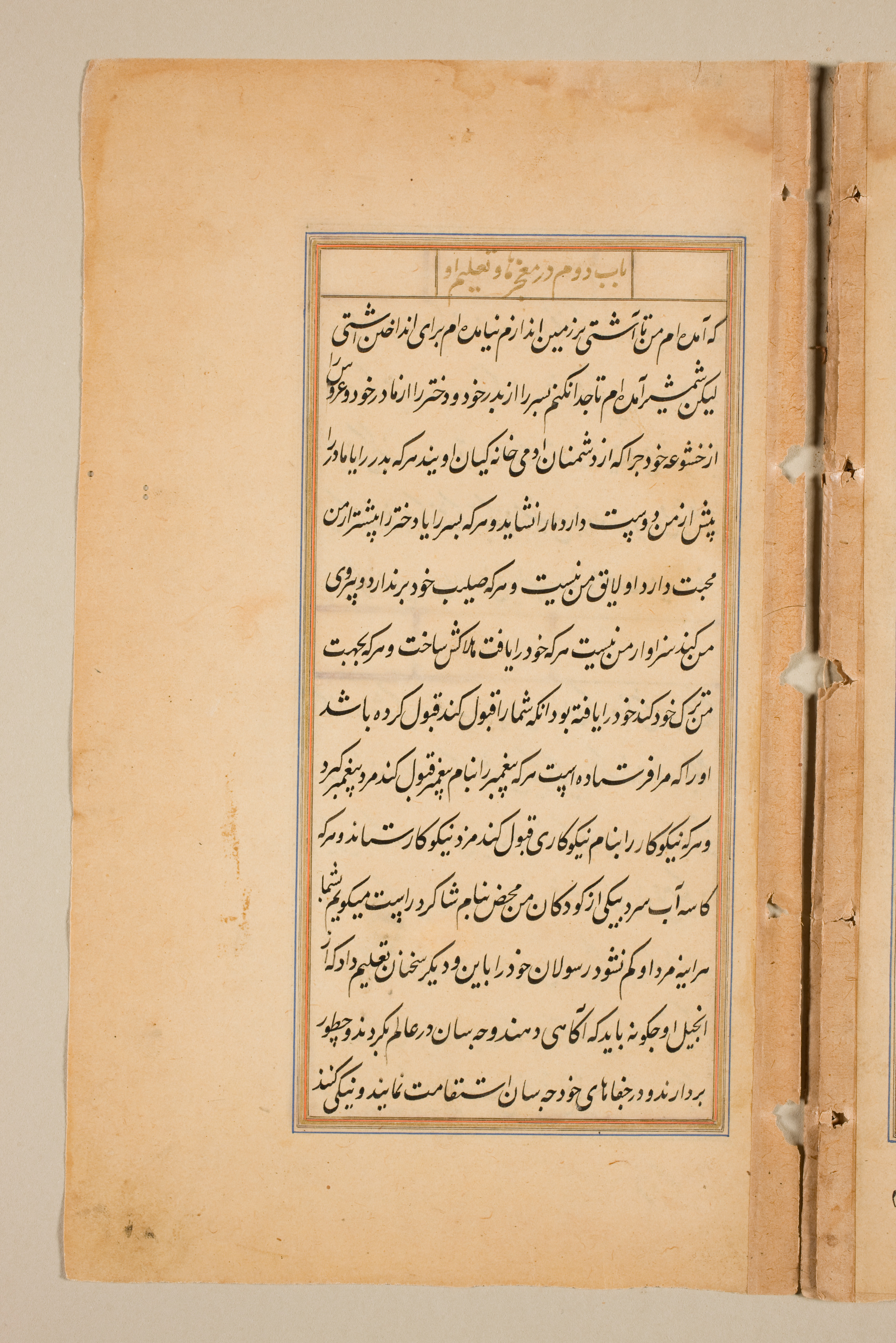 Yellowed, aged paper with darker spots. Black ink writing in a foreign script. Text bordered by thin blue and brown lines. Rectangle of text divided into two sections; a smaller one above, a larger one below. 3 holes along right edge with loose threads.