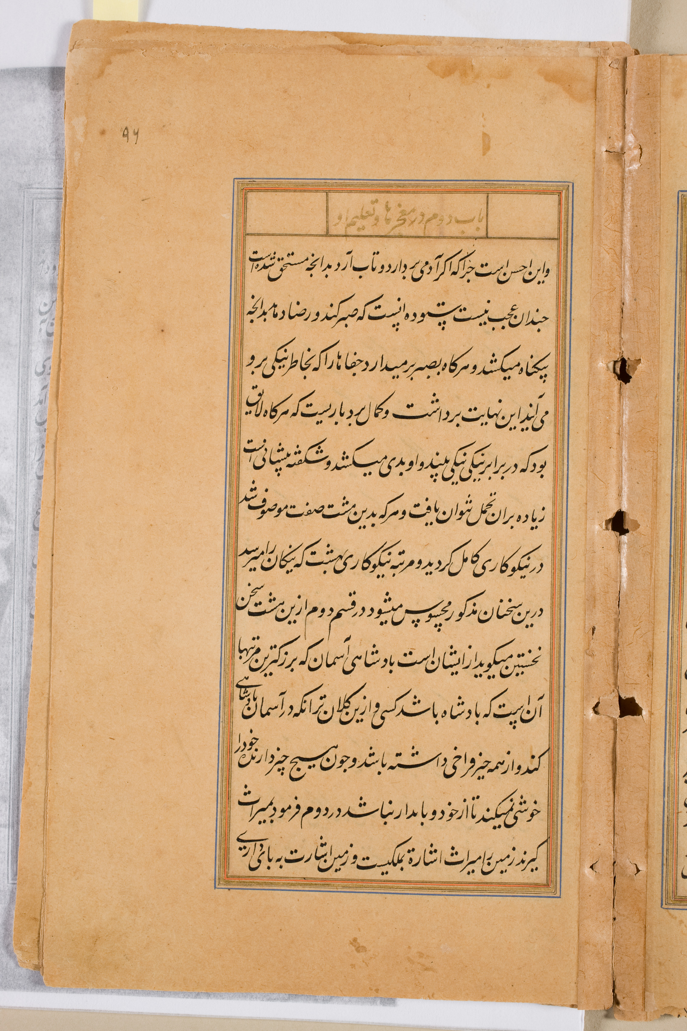 Yellowed, aged paper with darker yellow-brown stain marks. A blue-lined rectangle frames a block of black ink text written in a foreign language, likely Arabic or Persian script. Three small holes along the right edge of the page and a larger stain mark on the top right. A small number "44" written in black ink at the top left corner of the page. The page edges are rough and worn. The text is written in a single column within the blue-lined rectangle, with a smaller header section at the top. The right edge of the page is partially torn and worn. A gray and white surface is visible on the left side of the image, behind the page. A sliver of another page is visible on the right edge.