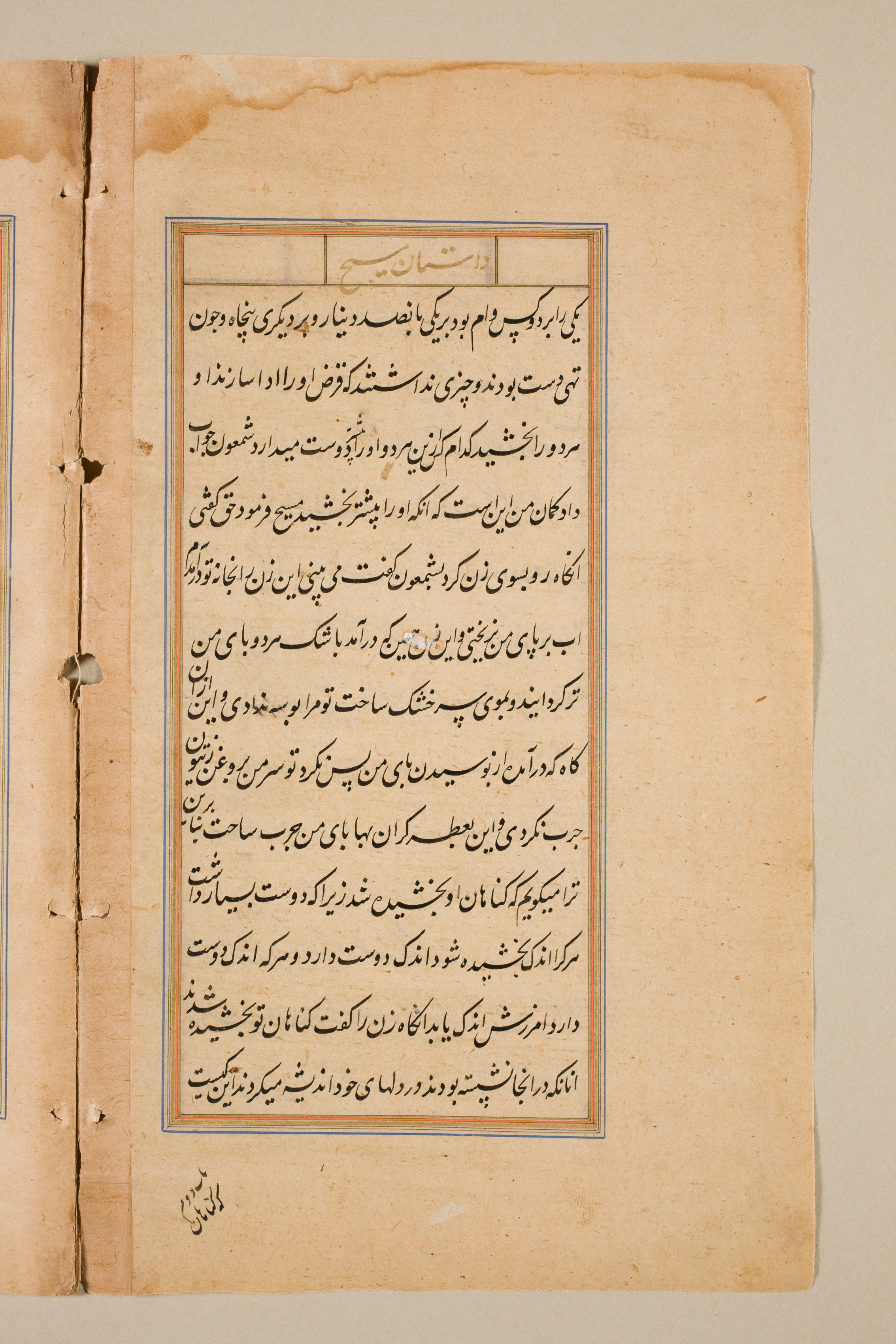An open book with yellowed pages. The page on the right has a blue and orange border around a block of black text written in a foreign language, likely Arabic script. The text is arranged in lines from top to bottom. A header with similar text is centered at the top of the block. The book's spine is visible on the left side, with small holes and darker stains. The edges of the pages are worn and browned. The background behind the book is plain and light-colored.