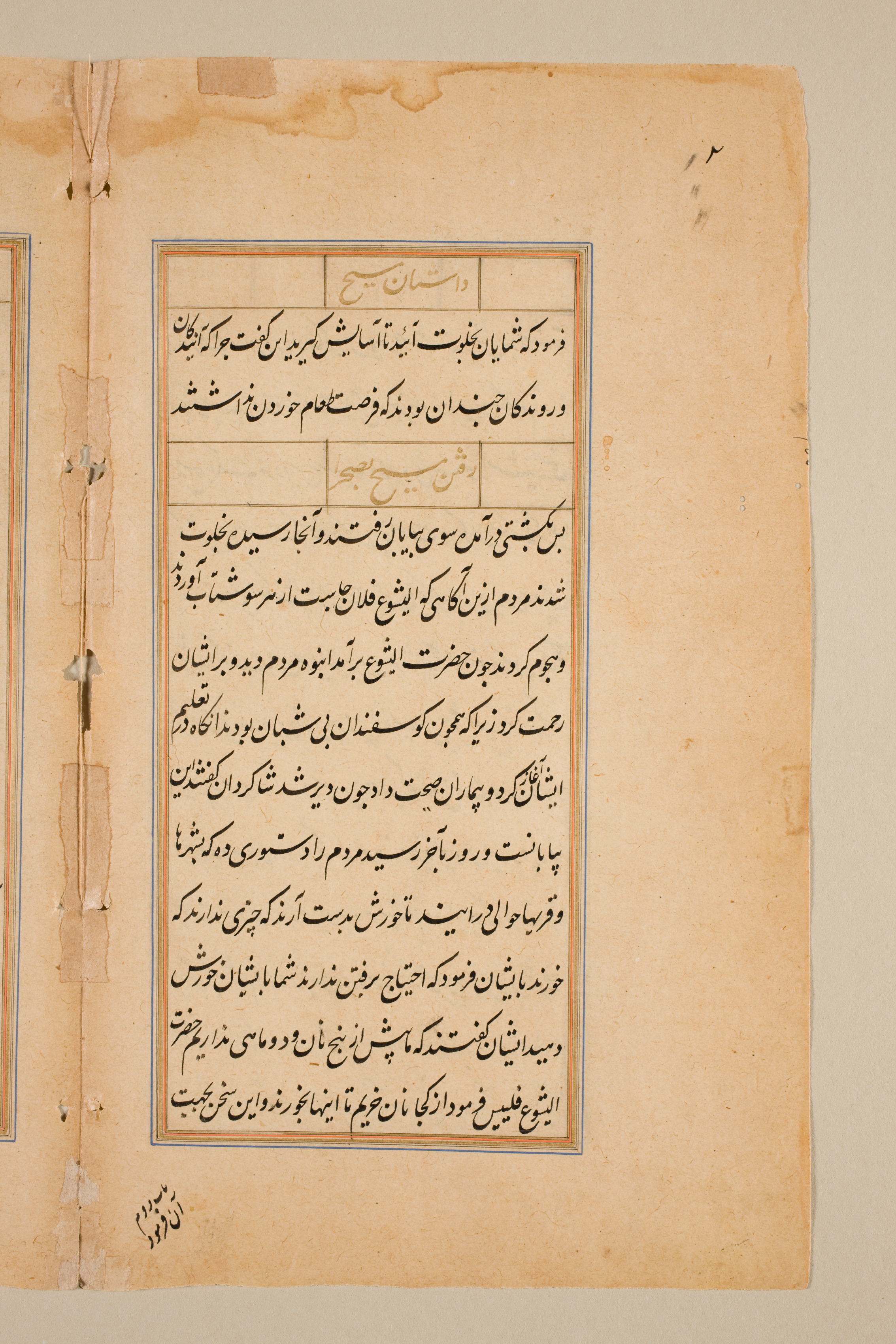 Yellowed, aged paper with darker edges. The page has a central block of text surrounded by a border with blue and orange lines. The text is written in black ink in a language that appears to be Arabic script. There are signs of wear, including brown spots, tears along the spine, and a partially visible adjacent page on the left. A beige background is visible on either side of the page.
