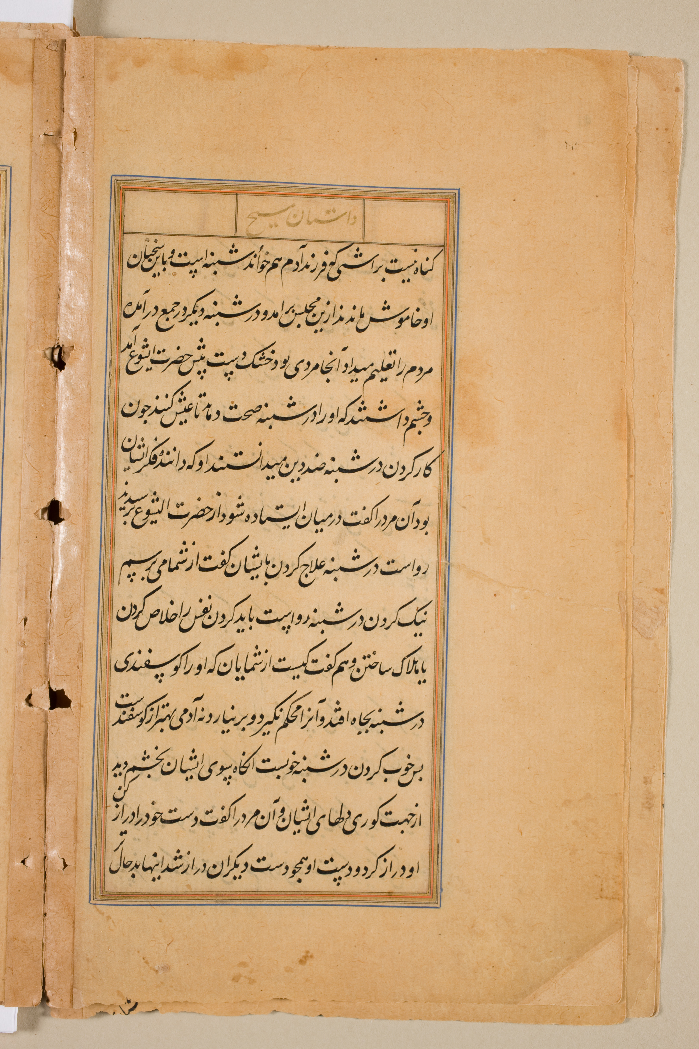 A book page with yellowed paper. The page is divided into two sections. On the left, a portion of the adjacent page with three holes on the left edge. The right section features a central rectangular text box outlined in blue and orange. The text box contains black calligraphy writing in a language that appears to be Arabic or Persian script. The text box has a smaller rectangular section at the top with writing. The background of the image is beige.